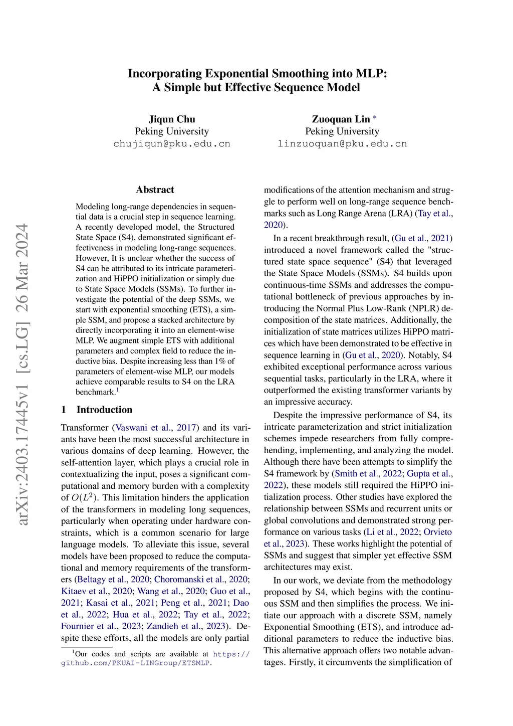 Modeling long-range dependencies in sequential data is a crucial step in sequence learning. A recently developed model, the Structured State Space (S4), demonstrated significant effectiveness in modeling long-range sequences. However, It is unclear whether the success of S4 can be attributed to its intricate parameterization and HiPPO initialization or simply due to State Space Models (SSMs). To further investigate the potential of the deep SSMs, we start with exponential smoothing (ETS), a simple SSM, and propose a stacked architecture by directly incorporating it into an element-wise MLP. We augment simple ETS with additional parameters and complex field to reduce the inductive bias. Despite increasing less than 1\% of parameters of element-wise MLP, our models achieve comparable results to S4 on the LRA benchmark.