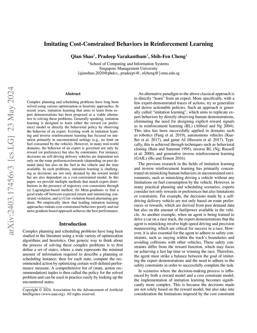 Complex planning and scheduling problems have long been solved using various optimization or heuristic approaches. In recent years, imitation learning that aims to learn from expert demonstrations has been proposed as a viable alternative to solving these problems. Generally speaking, imitation learning is designed to learn either the reward (or preference) model or directly the behavioral policy by observing the behavior of an expert. Existing work in imitation learning and inverse reinforcement learning has focused on imitation primarily in unconstrained settings (e.g., no limit on fuel consumed by the vehicle). However, in many real-world domains, the behavior of an expert is governed not only by reward (or preference) but also by constraints. For instance, decisions on self-driving delivery vehicles are dependent not only on the route preferences/rewards (depending on past demand data) but also on the fuel in the vehicle and the time available. In such problems, imitation learning is challenging as decisions are not only dictated by the reward model but are also dependent on a cost-constrained model. In this paper, we provide multiple methods that match expert distributions in the presence of trajectory cost constraints through (a) Lagrangian-based method; (b) Meta-gradients to find a good trade-off between expected return and minimizing constraint violation; and (c) Cost-violation-based alternating gradient. We empirically show that leading imitation learning approaches imitate cost-constrained behaviors poorly and our meta-gradient-based approach achieves the best performance.