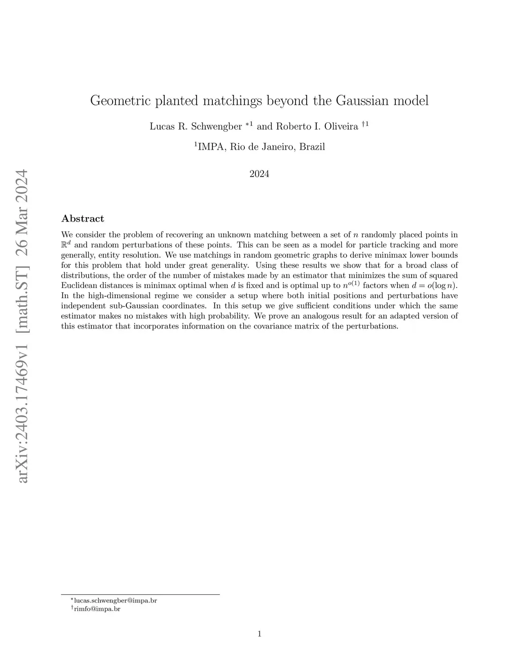 We consider the problem of recovering an unknown matching between a set of randomly placed points in and random perturbations of these points. This can be seen as a model for particle tracking and more generally, entity resolution. We use matchings in random geometric graphs to derive minimax lower bounds for this problem that hold under great generality. Using these results we show that for a broad class of distributions, the order of the number of mistakes made by an estimator that minimizes the sum of squared Euclidean distances is minimax optimal when is fixed and is optimal up to factors when . In the high-dimensional regime we consider a setup where both initial positions and perturbations have independent sub-Gaussian coordinates. In this setup we give sufficient conditions under which the same estimator makes no mistakes with high probability. We prove an analogous result for an adapted version of this estimator that incorporates information on the covariance matrix of the perturbations.