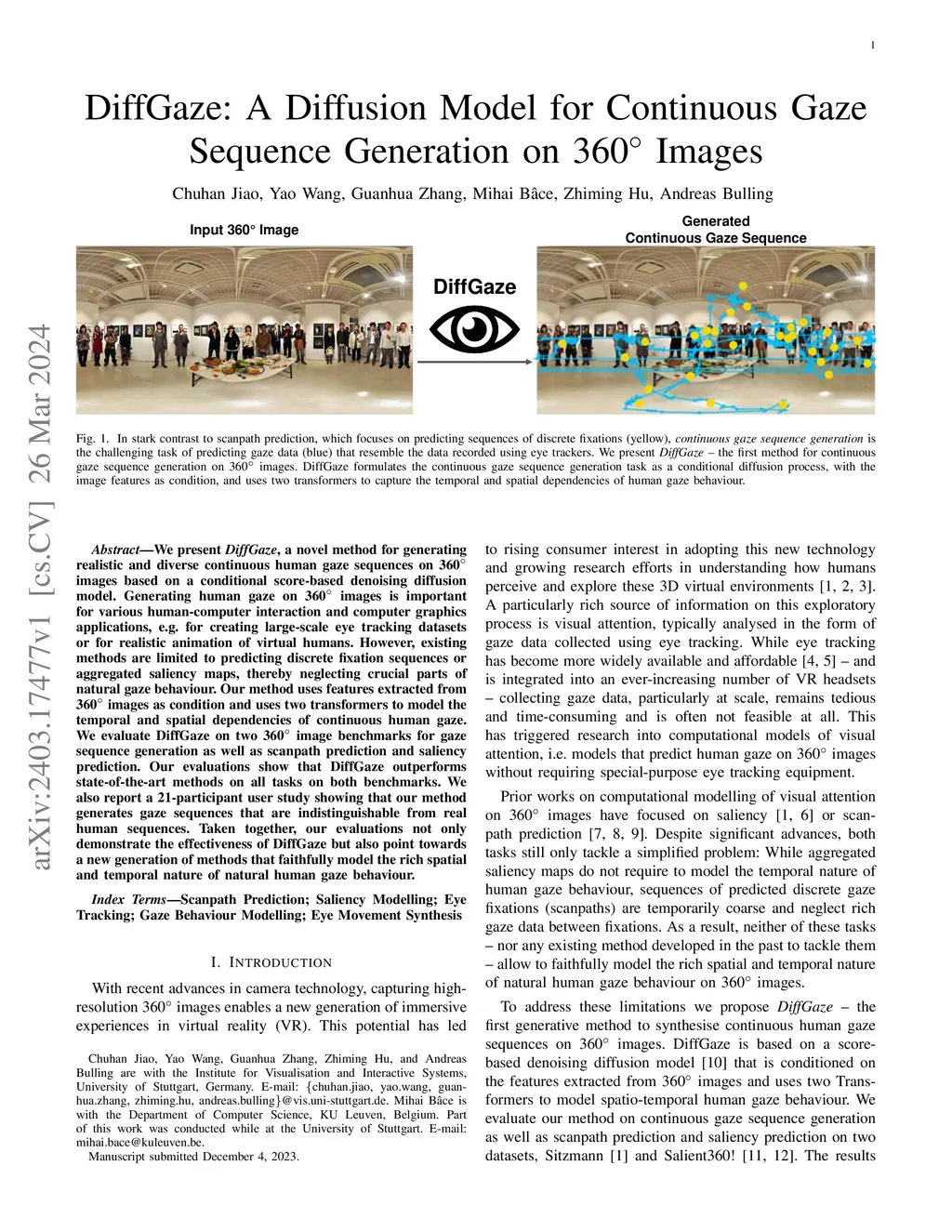 We present DiffGaze, a novel method for generating realistic and diverse continuous human gaze sequences on 360{\deg} images based on a conditional score-based denoising diffusion model. Generating human gaze on 360{\deg} images is important for various human-computer interaction and computer graphics applications, e.g. for creating large-scale eye tracking datasets or for realistic animation of virtual humans. However, existing methods are limited to predicting discrete fixation sequences or aggregated saliency maps, thereby neglecting crucial parts of natural gaze behaviour. Our method uses features extracted from 360{\deg} images as condition and uses two transformers to model the temporal and spatial dependencies of continuous human gaze. We evaluate DiffGaze on two 360{\deg} image benchmarks for gaze sequence generation as well as scanpath prediction and saliency prediction. Our evaluations show that DiffGaze outperforms state-of-the-art methods on all tasks on both benchmarks. We also report a 21-participant user study showing that our method generates gaze sequences that are indistinguishable from real human sequences.