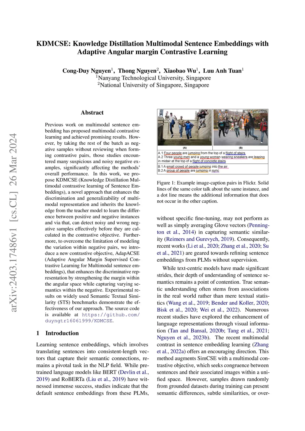 Previous work on multimodal sentence embedding has proposed multimodal contrastive learning and achieved promising results. However, by taking the rest of the batch as negative samples without reviewing when forming contrastive pairs, those studies encountered many suspicious and noisy negative examples, significantly affecting the methods' overall performance. In this work, we propose KDMCSE (Knowledge Distillation Multimodal contrastive learning of Sentence Embeddings), a novel approach that enhances the discrimination and generalizability of multimodal representation and inherits the knowledge from the teacher model to learn the difference between positive and negative instances and via that, can detect noisy and wrong negative samples effectively before they are calculated in the contrastive objective. Furthermore, to overcome the limitation of modeling the variation within negative pairs, we introduce a new contrastive objective, AdapACSE (Adaptive Angular Margin Supervised Contrastive Learning for Multimodal sentence embeddings), that enhances the discriminative representation by strengthening the margin within the angular space while capturing varying semantics within the negative. Experimental results on widely used Semantic Textual Similarity (STS) benchmarks demonstrate the effectiveness of our approach.
