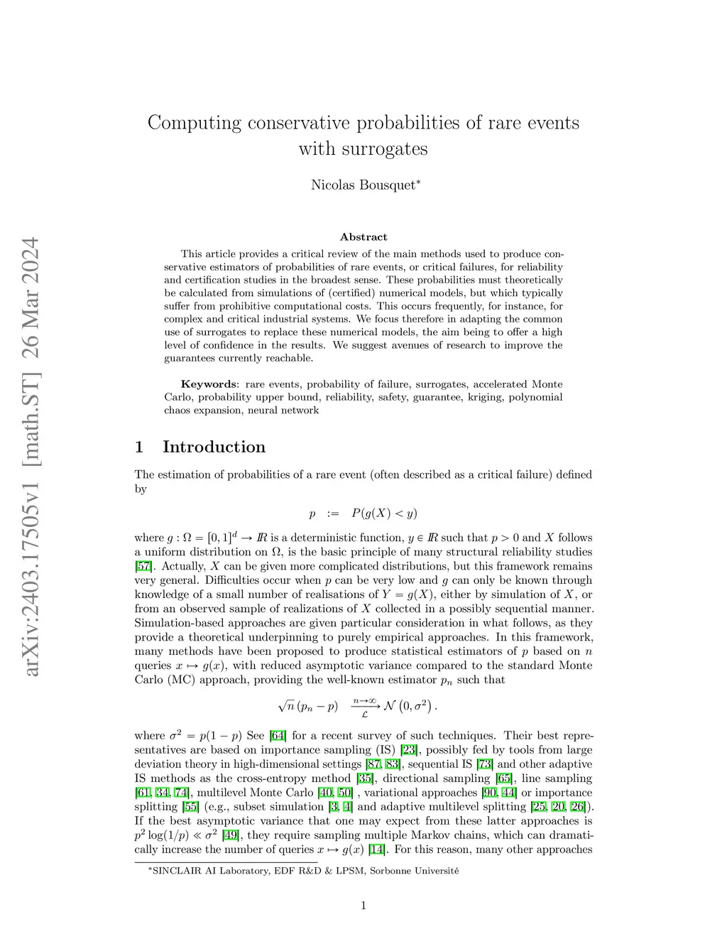 This article provides a critical review of the main methods used to produce conservative estimators of probabilities of rare events, or critical failures, for reliability and certification studies in the broadest sense. These probabilities must theoretically be calculated from simulations of (certified) numerical models, but which typically suffer from prohibitive computational costs. This occurs frequently, for instance, for complex and critical industrial systems. We focus therefore in adapting the common use of surrogates to replace these numerical models, the aim being to offer a high level of confidence in the results. We suggest avenues of research to improve the guarantees currently reachable.