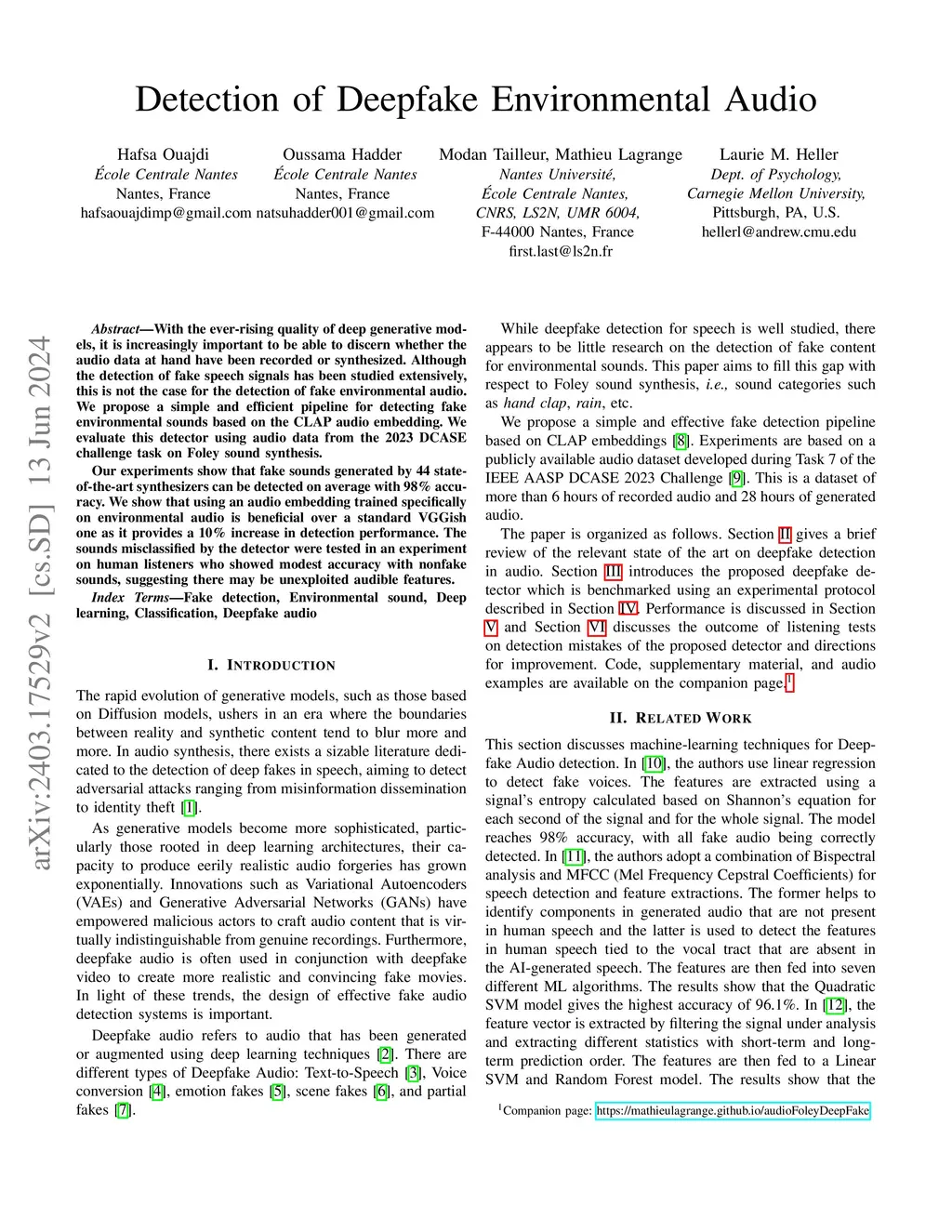 With the ever-rising quality of deep generative models, it is increasingly important to be able to discern whether the audio data at hand have been recorded or synthesized. Although the detection of fake speech signals has been studied extensively, this is not the case for the detection of fake environmental audio. We propose a simple and efficient pipeline for detecting fake environmental sounds based on the CLAP audio embedding. We evaluate this detector using audio data from the 2023 DCASE challenge task on Foley sound synthesis. Our experiments show that fake sounds generated by 44 state-of-the-art synthesizers can be detected on average with 98% accuracy. We show that using an audio embedding learned on environmental audio is beneficial over a standard VGGish one as it provides a 10% increase in detection performance. Informal listening to Incorrect Negative examples demonstrates audible features of fake sounds missed by the detector such as distortion and implausible background noise.