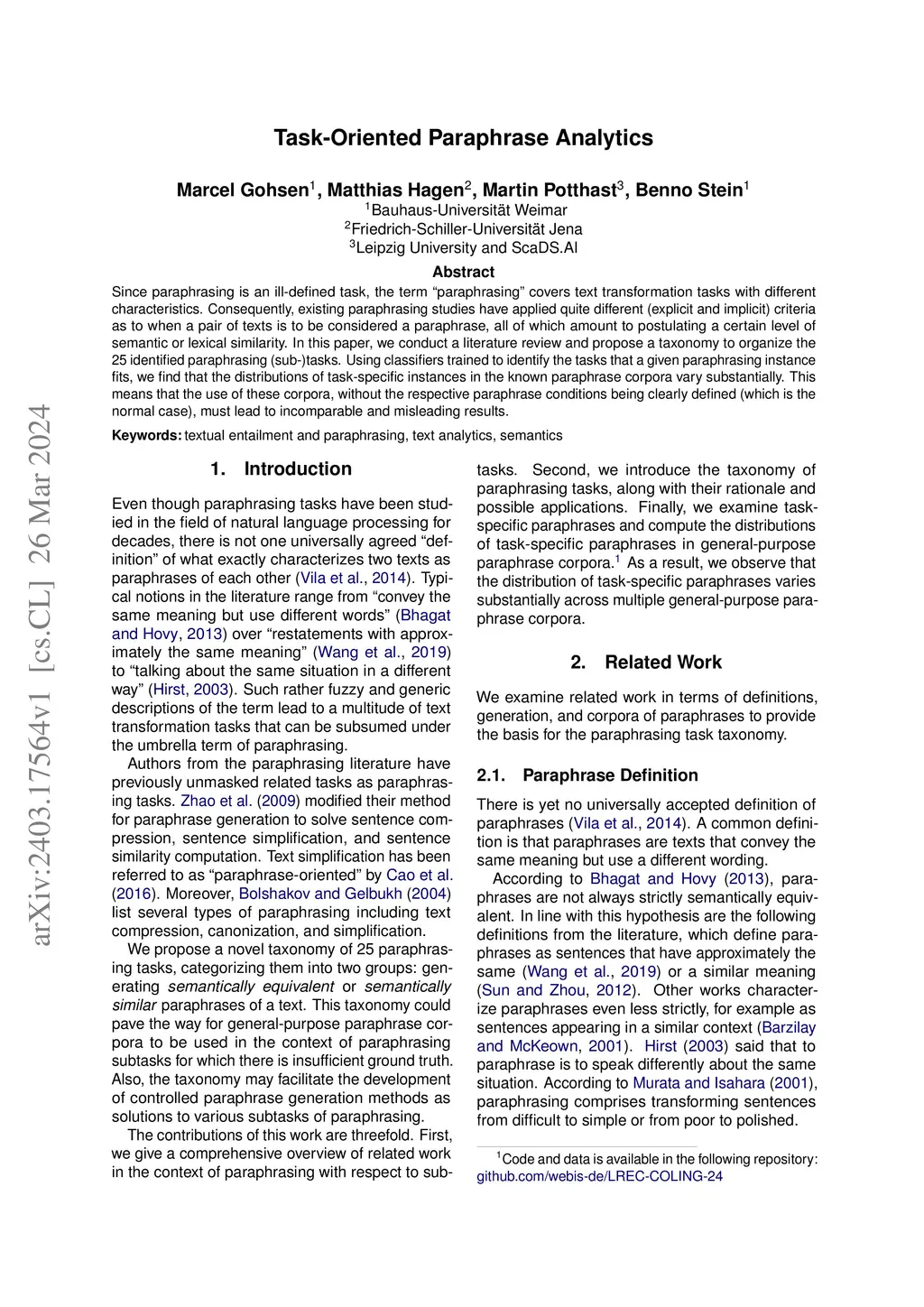 Since paraphrasing is an ill-defined task, the term "paraphrasing" covers text transformation tasks with different characteristics. Consequently, existing paraphrasing studies have applied quite different (explicit and implicit) criteria as to when a pair of texts is to be considered a paraphrase, all of which amount to postulating a certain level of semantic or lexical similarity. In this paper, we conduct a literature review and propose a taxonomy to organize the 25~identified paraphrasing (sub-)tasks. Using classifiers trained to identify the tasks that a given paraphrasing instance fits, we find that the distributions of task-specific instances in the known paraphrase corpora vary substantially. This means that the use of these corpora, without the respective paraphrase conditions being clearly defined (which is the normal case), must lead to incomparable and misleading results.