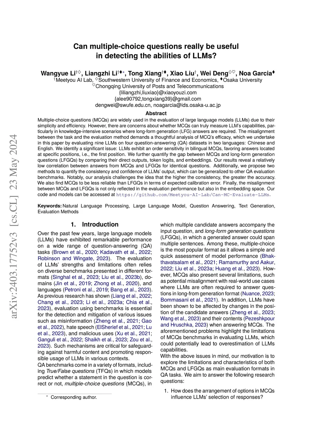 Multiple-choice questions (MCQs) are widely used in the evaluation of large language models (LLMs) due to their simplicity and efficiency. However, there are concerns about whether MCQs can truly measure LLM's capabilities, particularly in knowledge-intensive scenarios where long-form generation (LFG) answers are required. The misalignment between the task and the evaluation method demands a thoughtful analysis of MCQ's efficacy, which we undertake in this paper by evaluating nine LLMs on four question-answering (QA) datasets in two languages: Chinese and English. We identify a significant issue: LLMs exhibit an order sensitivity in bilingual MCQs, favoring answers located at specific positions, i.e., the first position. We further quantify the gap between MCQs and long-form generation questions (LFGQs) by comparing their direct outputs, token logits, and embeddings. Our results reveal a relatively low correlation between answers from MCQs and LFGQs for identical questions. Additionally, we propose two methods to quantify the consistency and confidence of LLMs' output, which can be generalized to other QA evaluation benchmarks. Notably, our analysis challenges the idea that the higher the consistency, the greater the accuracy. We also find MCQs to be less reliable than LFGQs in terms of expected calibration error. Finally, the misalignment between MCQs and LFGQs is not only reflected in the evaluation performance but also in the embedding space. Our code and models can be accessed at https://github.com/Meetyou-AI-Lab/Can-MC-Evaluate-LLMs.