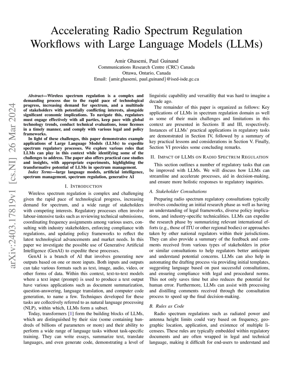 Wireless spectrum regulation is a complex and demanding process due to the rapid pace of technological progress, increasing demand for spectrum, and a multitude of stakeholders with potentially conflicting interests, alongside significant economic implications. To navigate this, regulators must engage effectively with all parties, keep pace with global technology trends, conduct technical evaluations, issue licenses in a timely manner, and comply with various legal and policy frameworks. In light of these challenges, this paper demonstrates example applications of Large Language Models (LLMs) to expedite spectrum regulatory processes. We explore various roles that LLMs can play in this context while identifying some of the challenges to address. The paper also offers practical case studies and insights, with appropriate experiments, highlighting the transformative potential of LLMs in spectrum management.