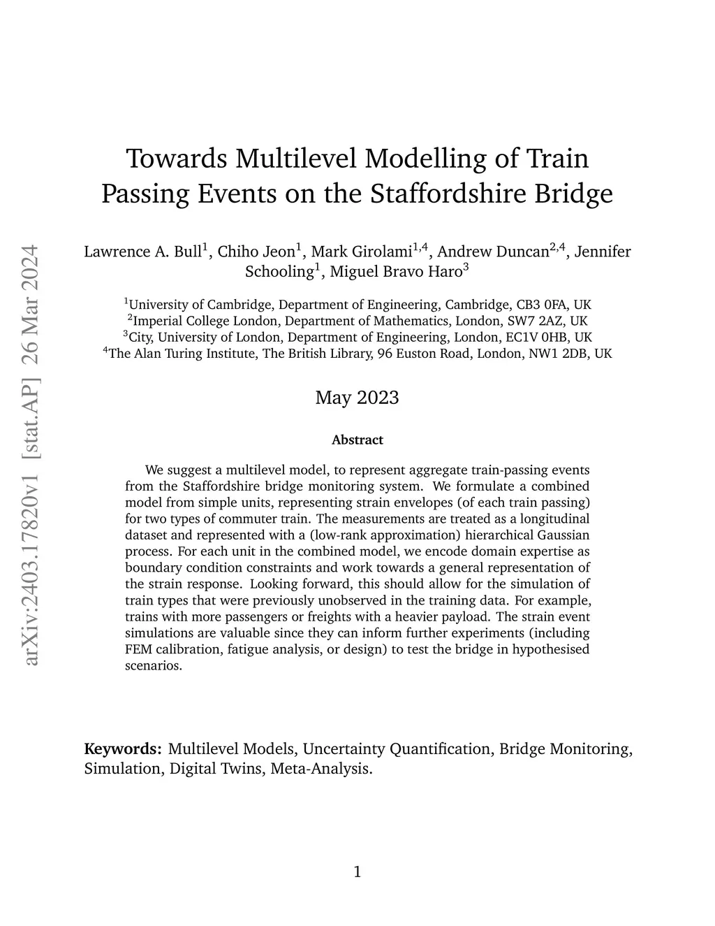 We suggest a multilevel model, to represent aggregate train-passing events from the Staffordshire bridge monitoring system. We formulate a combined model from simple units, representing strain envelopes (of each train passing) for two types of commuter train. The measurements are treated as a longitudinal dataset and represented with a (low-rank approximation) hierarchical Gaussian process. For each unit in the combined model, we encode domain expertise as boundary condition constraints and work towards a general representation of the strain response. Looking forward, this should allow for the simulation of train types that were previously unobserved in the training data. For example, trains with more passengers or freights with a heavier payload. The strain event simulations are valuable since they can inform further experiments (including FEM calibration, fatigue analysis, or design) to test the bridge in hypothesised scenarios.
