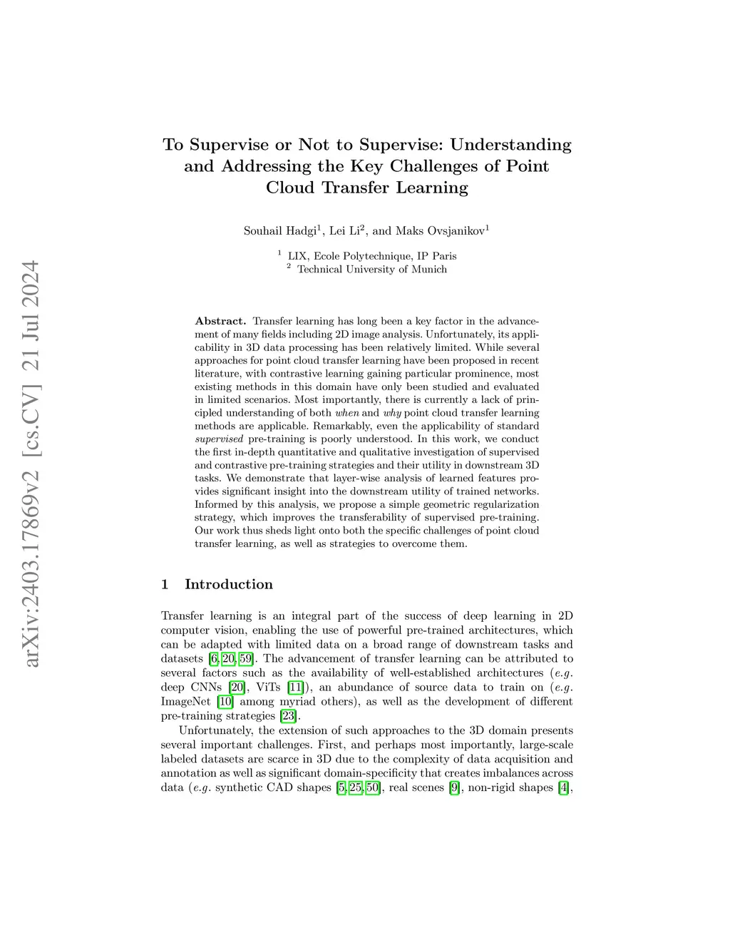 Transfer learning has long been a key factor in the advancement of many fields including 2D image analysis. Unfortunately, its applicability in 3D data processing has been relatively limited. While several approaches for 3D transfer learning have been proposed in recent literature, with contrastive learning gaining particular prominence, most existing methods in this domain have only been studied and evaluated in limited scenarios. Most importantly, there is currently a lack of principled understanding of both when and why 3D transfer learning methods are applicable. Remarkably, even the applicability of standard supervised pre-training is poorly understood. In this work, we conduct the first in-depth quantitative and qualitative investigation of supervised and contrastive pre-training strategies and their utility in downstream 3D tasks. We demonstrate that layer-wise analysis of learned features provides significant insight into the downstream utility of trained networks. Informed by this analysis, we propose a simple geometric regularization strategy, which improves the transferability of supervised pre-training. Our work thus sheds light onto both the specific challenges of 3D transfer learning, as well as strategies to overcome them.