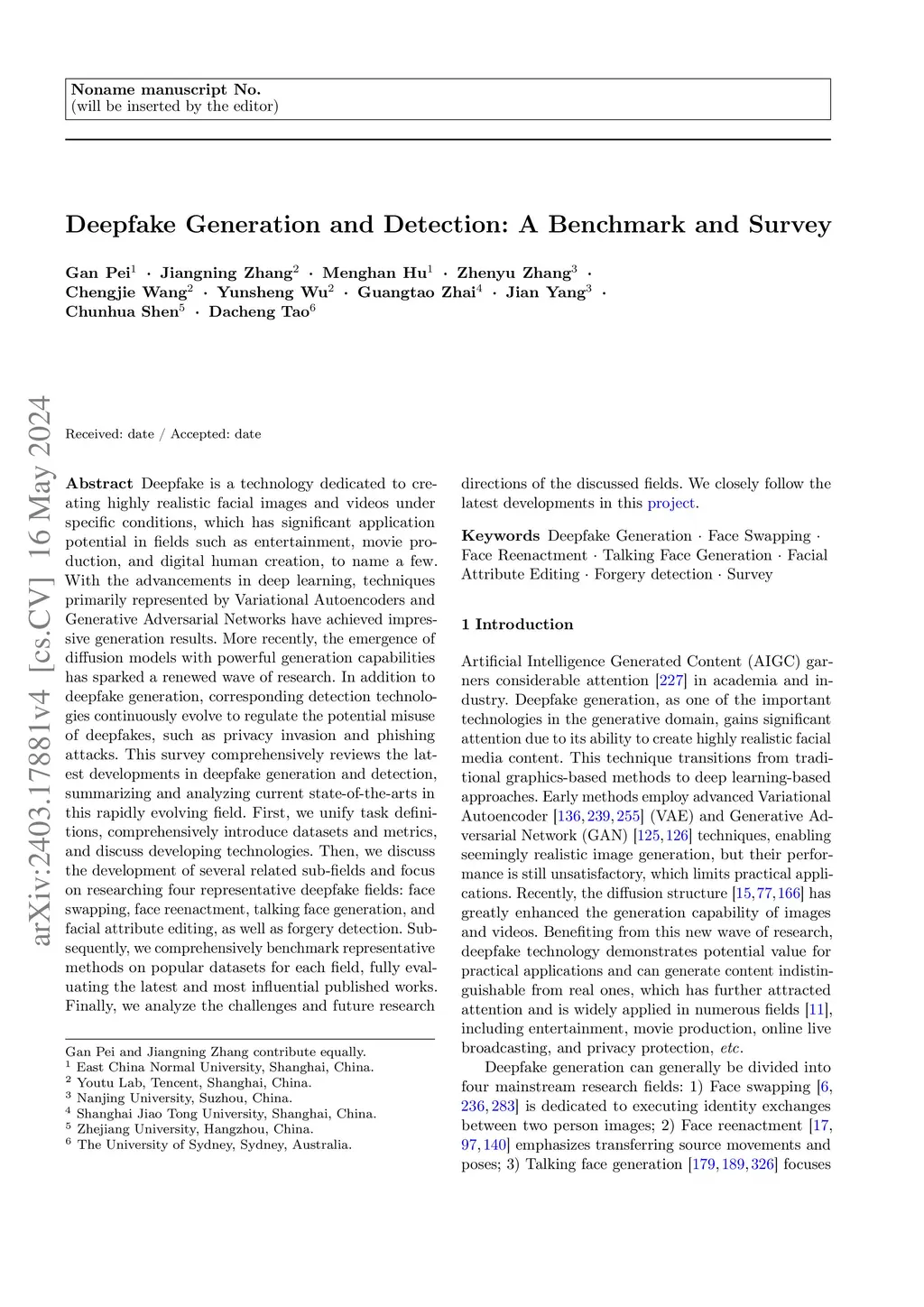 Deepfake is a technology dedicated to creating highly realistic facial images and videos under specific conditions, which has significant application potential in fields such as entertainment, movie production, digital human creation, to name a few. With the advancements in deep learning, techniques primarily represented by Variational Autoencoders and Generative Adversarial Networks have achieved impressive generation results. More recently, the emergence of diffusion models with powerful generation capabilities has sparked a renewed wave of research. In addition to deepfake generation, corresponding detection technologies continuously evolve to regulate the potential misuse of deepfakes, such as for privacy invasion and phishing attacks. This survey comprehensively reviews the latest developments in deepfake generation and detection, summarizing and analyzing current state-of-the-arts in this rapidly evolving field. We first unify task definitions, comprehensively introduce datasets and metrics, and discuss developing technologies. Then, we discuss the development of several related sub-fields and focus on researching four representative deepfake fields: face swapping, face reenactment, talking face generation, and facial attribute editing, as well as forgery detection. Subsequently, we comprehensively benchmark representative methods on popular datasets for each field, fully evaluating the latest and influential published works. Finally, we analyze challenges and future research directions of the discussed fields.
