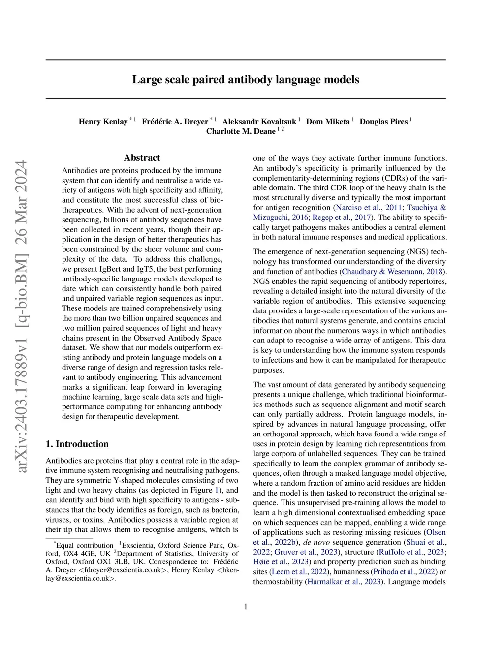 Antibodies are proteins produced by the immune system that can identify and neutralise a wide variety of antigens with high specificity and affinity, and constitute the most successful class of biotherapeutics. With the advent of next-generation sequencing, billions of antibody sequences have been collected in recent years, though their application in the design of better therapeutics has been constrained by the sheer volume and complexity of the data. To address this challenge, we present IgBert and IgT5, the best performing antibody-specific language models developed to date which can consistently handle both paired and unpaired variable region sequences as input. These models are trained comprehensively using the more than two billion unpaired sequences and two million paired sequences of light and heavy chains present in the Observed Antibody Space dataset. We show that our models outperform existing antibody and protein language models on a diverse range of design and regression tasks relevant to antibody engineering. This advancement marks a significant leap forward in leveraging machine learning, large scale data sets and high-performance computing for enhancing antibody design for therapeutic development.