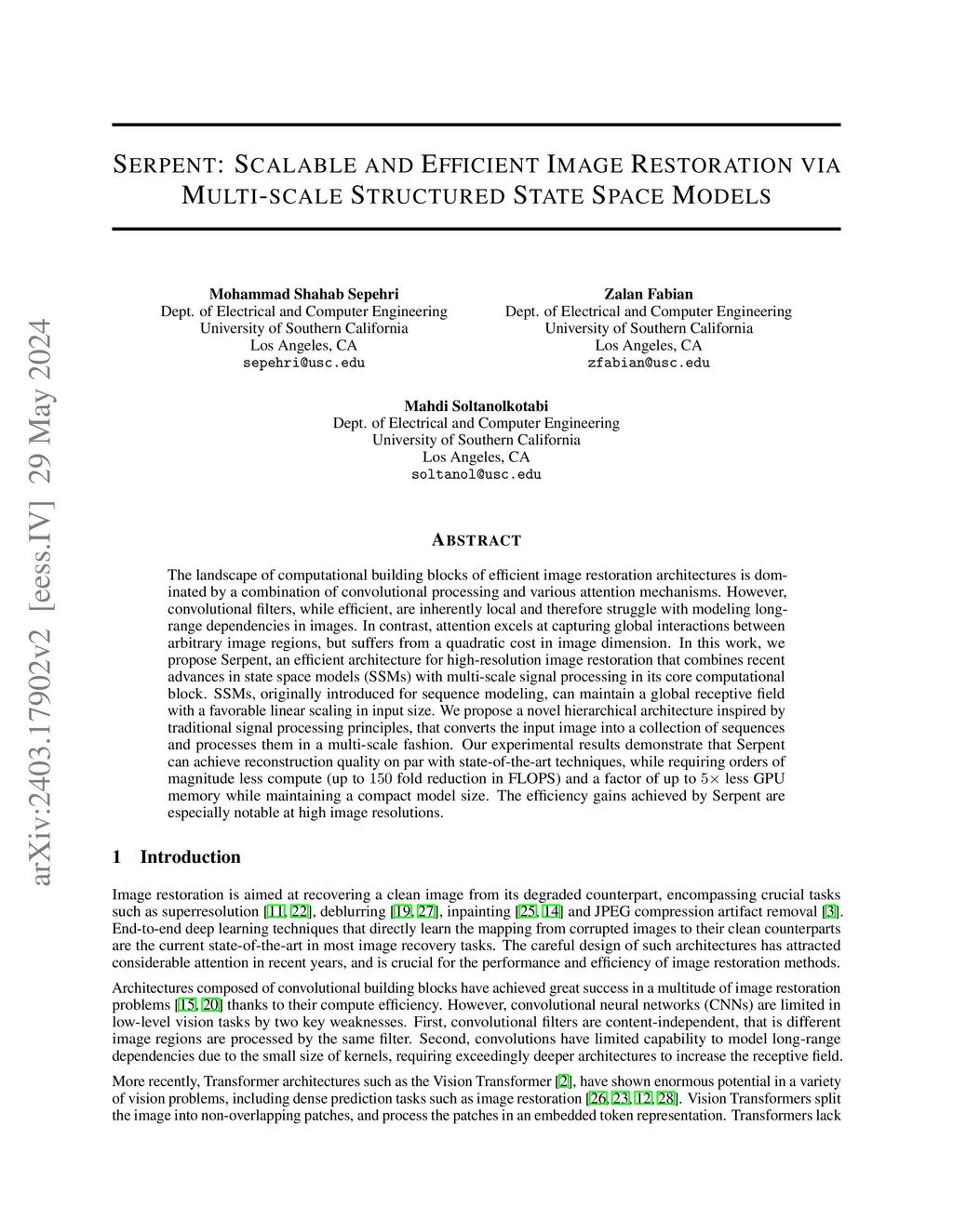 The landscape of computational building blocks of efficient image restoration architectures is dominated by a combination of convolutional processing and various attention mechanisms. However, convolutional filters, while efficient, are inherently local and therefore struggle with modeling long-range dependencies in images. In contrast, attention excels at capturing global interactions between arbitrary image regions, but suffers from a quadratic cost in image dimension. In this work, we propose Serpent, an efficient architecture for high-resolution image restoration that combines recent advances in state space models (SSMs) with multi-scale signal processing in its core computational block. SSMs, originally introduced for sequence modeling, can maintain a global receptive field with a favorable linear scaling in input size. We propose a novel hierarchical architecture inspired by traditional signal processing principles, that converts the input image into a collection of sequences and processes them in a multi-scale fashion. Our experimental results demonstrate that Serpent can achieve reconstruction quality on par with state-of-the-art techniques, while requiring orders of magnitude less compute (up to fold reduction in FLOPS) and a factor of up to less GPU memory while maintaining a compact model size. The efficiency gains achieved by Serpent are especially notable at high image resolutions.