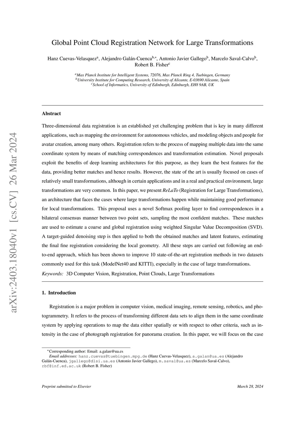 Three-dimensional data registration is an established yet challenging problem that is key in many different applications, such as mapping the environment for autonomous vehicles, and modeling objects and people for avatar creation, among many others. Registration refers to the process of mapping multiple data into the same coordinate system by means of matching correspondences and transformation estimation. Novel proposals exploit the benefits of deep learning architectures for this purpose, as they learn the best features for the data, providing better matches and hence results. However, the state of the art is usually focused on cases of relatively small transformations, although in certain applications and in a real and practical environment, large transformations are very common. In this paper, we present ReLaTo (Registration for Large Transformations), an architecture that faces the cases where large transformations happen while maintaining good performance for local transformations. This proposal uses a novel Softmax pooling layer to find correspondences in a bilateral consensus manner between two point sets, sampling the most confident matches. These matches are used to estimate a coarse and global registration using weighted Singular Value Decomposition (SVD). A target-guided denoising step is then applied to both the obtained matches and latent features, estimating the final fine registration considering the local geometry. All these steps are carried out following an end-to-end approach, which has been shown to improve 10 state-of-the-art registration methods in two datasets commonly used for this task (ModelNet40 and KITTI), especially in the case of large transformations.