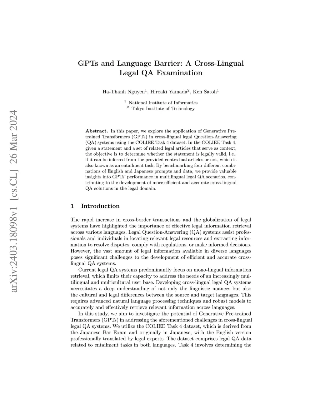 In this paper, we explore the application of Generative Pre-trained Transformers (GPTs) in cross-lingual legal Question-Answering (QA) systems using the COLIEE Task 4 dataset. In the COLIEE Task 4, given a statement and a set of related legal articles that serve as context, the objective is to determine whether the statement is legally valid, i.e., if it can be inferred from the provided contextual articles or not, which is also known as an entailment task. By benchmarking four different combinations of English and Japanese prompts and data, we provide valuable insights into GPTs' performance in multilingual legal QA scenarios, contributing to the development of more efficient and accurate cross-lingual QA solutions in the legal domain.