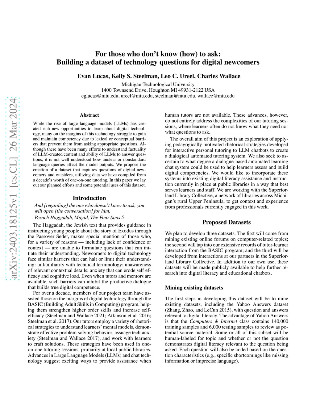 While the rise of large language models (LLMs) has created rich new opportunities to learn about digital technology, many on the margins of this technology struggle to gain and maintain competency due to lexical or conceptual barriers that prevent them from asking appropriate questions. Although there have been many efforts to understand factuality of LLM-created content and ability of LLMs to answer questions, it is not well understood how unclear or nonstandard language queries affect the model outputs. We propose the creation of a dataset that captures questions of digital newcomers and outsiders, utilizing data we have compiled from a decade's worth of one-on-one tutoring. In this paper we lay out our planned efforts and some potential uses of this dataset.