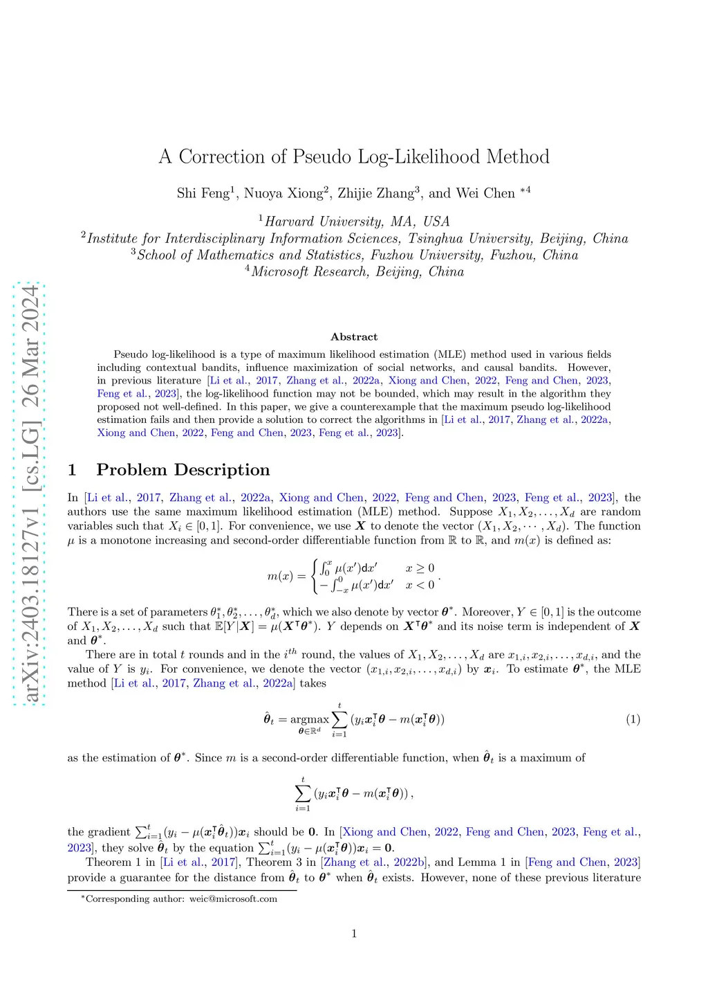 Pseudo log-likelihood is a type of maximum likelihood estimation (MLE) method used in various fields including contextual bandits, influence maximization of social networks, and causal bandits. However, in previous literature \citep{li2017provably, zhang2022online, xiong2022combinatorial, feng2023combinatorial1, feng2023combinatorial2}, the log-likelihood function may not be bounded, which may result in the algorithm they proposed not well-defined. In this paper, we give a counterexample that the maximum pseudo log-likelihood estimation fails and then provide a solution to correct the algorithms in \citep{li2017provably, zhang2022online, xiong2022combinatorial, feng2023combinatorial1, feng2023combinatorial2}.