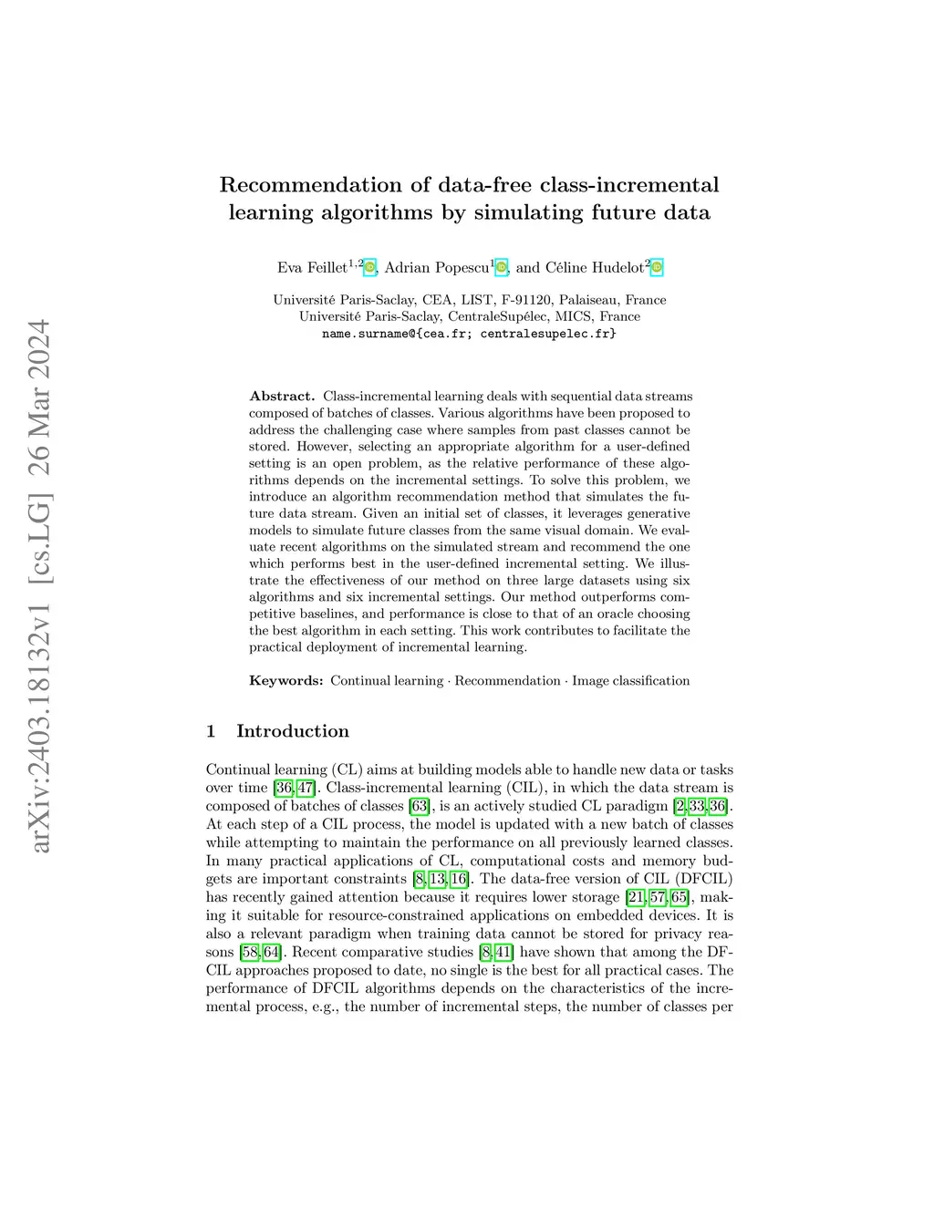 Class-incremental learning deals with sequential data streams composed of batches of classes. Various algorithms have been proposed to address the challenging case where samples from past classes cannot be stored. However, selecting an appropriate algorithm for a user-defined setting is an open problem, as the relative performance of these algorithms depends on the incremental settings. To solve this problem, we introduce an algorithm recommendation method that simulates the future data stream. Given an initial set of classes, it leverages generative models to simulate future classes from the same visual domain. We evaluate recent algorithms on the simulated stream and recommend the one which performs best in the user-defined incremental setting. We illustrate the effectiveness of our method on three large datasets using six algorithms and six incremental settings. Our method outperforms competitive baselines, and performance is close to that of an oracle choosing the best algorithm in each setting. This work contributes to facilitate the practical deployment of incremental learning.