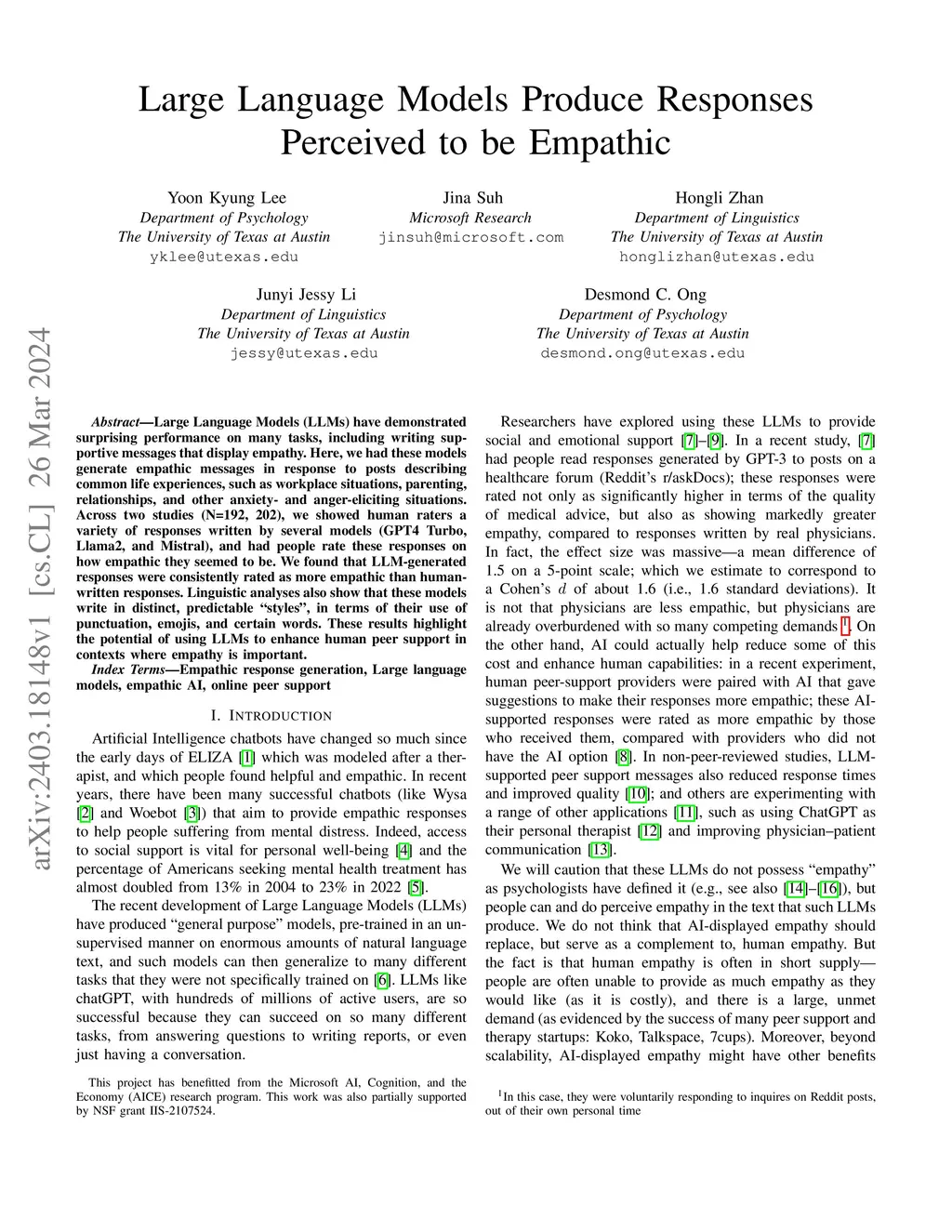 Large Language Models Produce Responses Perceived to be Empathic