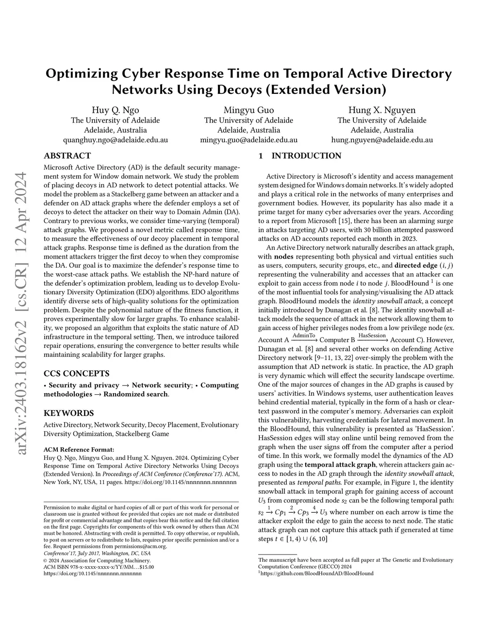 Microsoft Active Directory (AD) is the default security management system for Window domain network. We study the problem of placing decoys in AD network to detect potential attacks. We model the problem as a Stackelberg game between an attacker and a defender on AD attack graphs where the defender employs a set of decoys to detect the attacker on their way to Domain Admin (DA). Contrary to previous works, we consider time-varying (temporal) attack graphs. We proposed a novel metric called response time, to measure the effectiveness of our decoy placement in temporal attack graphs. Response time is defined as the duration from the moment attackers trigger the first decoy to when they compromise the DA. Our goal is to maximize the defender's response time to the worst-case attack paths. We establish the NP-hard nature of the defender's optimization problem, leading us to develop Evolutionary Diversity Optimization (EDO) algorithms. EDO algorithms identify diverse sets of high-quality solutions for the optimization problem. Despite the polynomial nature of the fitness function, it proves experimentally slow for larger graphs. To enhance scalability, we proposed an algorithm that exploits the static nature of AD infrastructure in the temporal setting. Then, we introduce tailored repair operations, ensuring the convergence to better results while maintaining scalability for larger graphs.