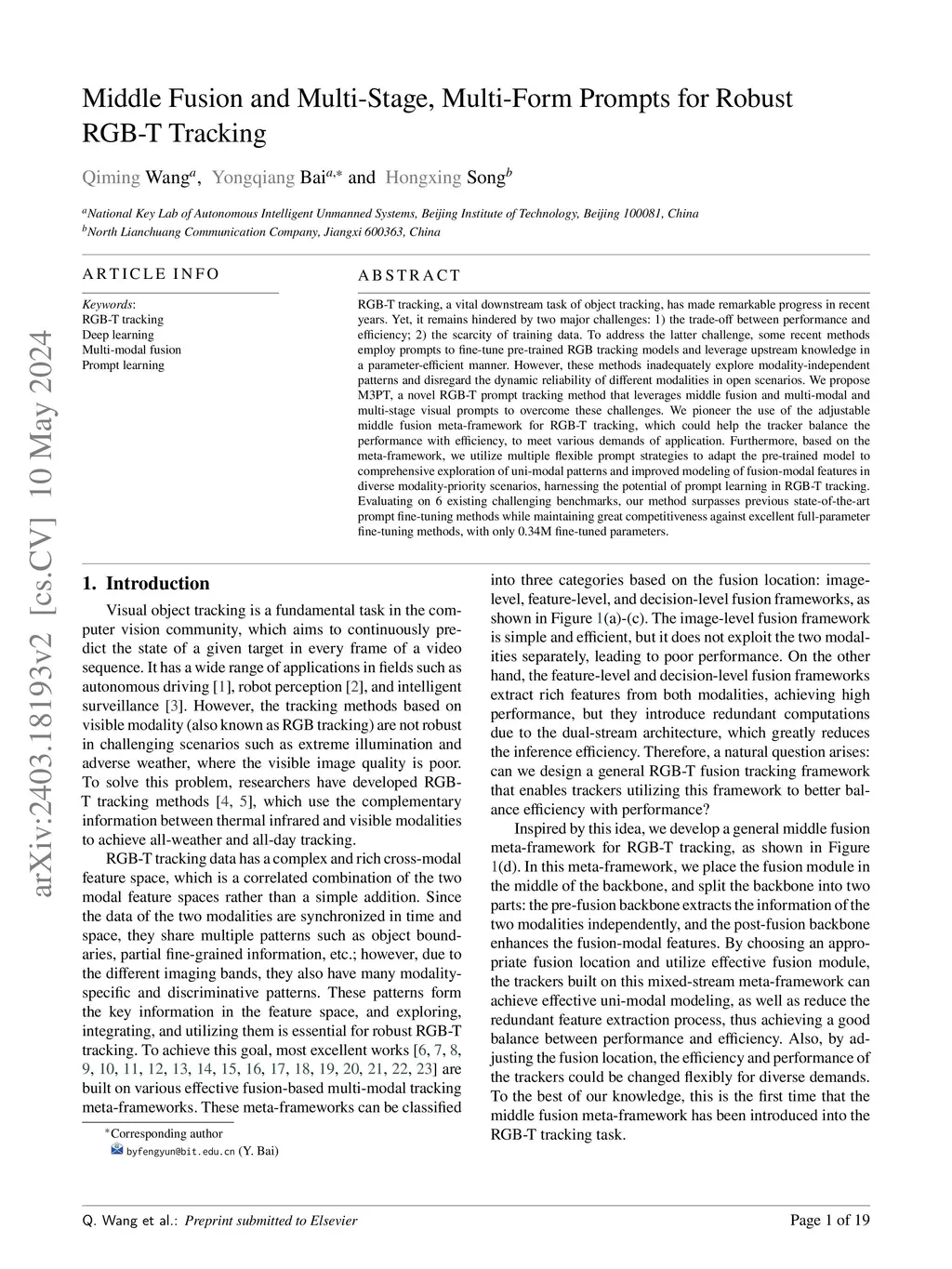 RGB-T tracking, a vital downstream task of object tracking, has made remarkable progress in recent years. Yet, it remains hindered by two major challenges: 1) the trade-off between performance and efficiency; 2) the scarcity of training data. To address the latter challenge, some recent methods employ prompts to fine-tune pre-trained RGB tracking models and leverage upstream knowledge in a parameter-efficient manner. However, these methods inadequately explore modality-independent patterns and disregard the dynamic reliability of different modalities in open scenarios. We propose M3PT, a novel RGB-T prompt tracking method that leverages middle fusion and multi-modal and multi-stage visual prompts to overcome these challenges. We pioneer the use of the adjustable middle fusion meta-framework for RGB-T tracking, which could help the tracker balance the performance with efficiency, to meet various demands of application. Furthermore, based on the meta-framework, we utilize multiple flexible prompt strategies to adapt the pre-trained model to comprehensive exploration of uni-modal patterns and improved modeling of fusion-modal features in diverse modality-priority scenarios, harnessing the potential of prompt learning in RGB-T tracking. Evaluating on 6 existing challenging benchmarks, our method surpasses previous state-of-the-art prompt fine-tuning methods while maintaining great competitiveness against excellent full-parameter fine-tuning methods, with only 0.34M fine-tuned parameters.