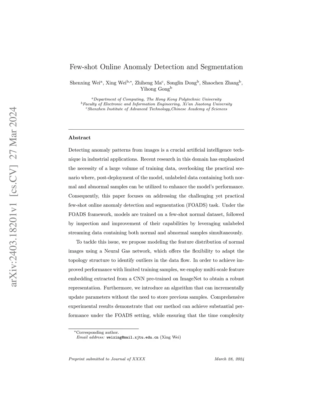Detecting anomaly patterns from images is a crucial artificial intelligence technique in industrial applications. Recent research in this domain has emphasized the necessity of a large volume of training data, overlooking the practical scenario where, post-deployment of the model, unlabeled data containing both normal and abnormal samples can be utilized to enhance the model's performance. Consequently, this paper focuses on addressing the challenging yet practical few-shot online anomaly detection and segmentation (FOADS) task. Under the FOADS framework, models are trained on a few-shot normal dataset, followed by inspection and improvement of their capabilities by leveraging unlabeled streaming data containing both normal and abnormal samples simultaneously.To tackle this issue, we propose modeling the feature distribution of normal images using a Neural Gas network, which offers the flexibility to adapt the topology structure to identify outliers in the data flow. In order to achieve improved performance with limited training samples, we employ multi-scale feature embedding extracted from a CNN pre-trained on ImageNet to obtain a robust representation. Furthermore, we introduce an algorithm that can incrementally update parameters without the need to store previous samples. Comprehensive experimental results demonstrate that our method can achieve substantial performance under the FOADS setting, while ensuring that the time complexity remains within an acceptable range on MVTec AD and BTAD datasets.