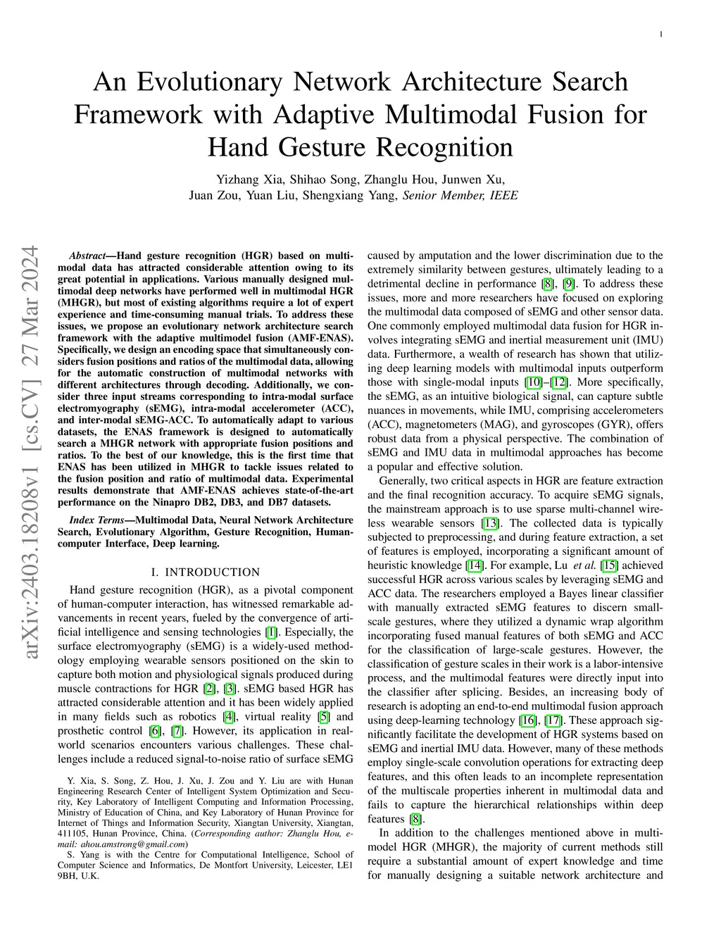 Hand gesture recognition (HGR) based on multimodal data has attracted considerable attention owing to its great potential in applications. Various manually designed multimodal deep networks have performed well in multimodal HGR (MHGR), but most of existing algorithms require a lot of expert experience and time-consuming manual trials. To address these issues, we propose an evolutionary network architecture search framework with the adaptive multimodel fusion (AMF-ENAS). Specifically, we design an encoding space that simultaneously considers fusion positions and ratios of the multimodal data, allowing for the automatic construction of multimodal networks with different architectures through decoding. Additionally, we consider three input streams corresponding to intra-modal surface electromyography (sEMG), intra-modal accelerometer (ACC), and inter-modal sEMG-ACC. To automatically adapt to various datasets, the ENAS framework is designed to automatically search a MHGR network with appropriate fusion positions and ratios. To the best of our knowledge, this is the first time that ENAS has been utilized in MHGR to tackle issues related to the fusion position and ratio of multimodal data. Experimental results demonstrate that AMF-ENAS achieves state-of-the-art performance on the Ninapro DB2, DB3, and DB7 datasets.