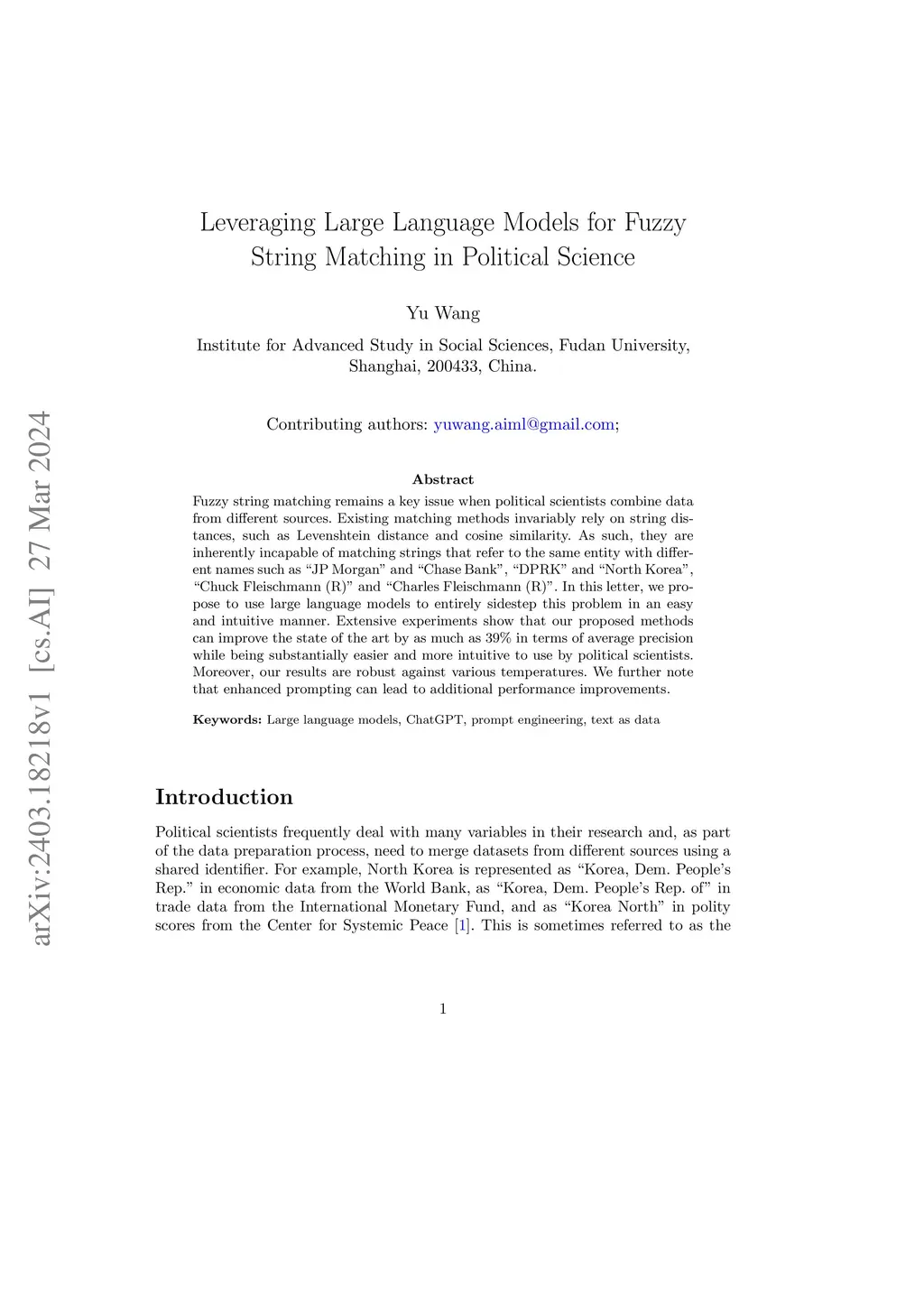 Fuzzy string matching remains a key issue when political scientists combine data from different sources. Existing matching methods invariably rely on string distances, such as Levenshtein distance and cosine similarity. As such, they are inherently incapable of matching strings that refer to the same entity with different names such as ''JP Morgan'' and ''Chase Bank'', ''DPRK'' and 'Ñorth Korea'', ''Chuck Fleischmann (R)'' and ''Charles Fleischmann (R)''. In this letter, we propose to use large language models to entirely sidestep this problem in an easy and intuitive manner. Extensive experiments show that our proposed methods can improve the state of the art by as much as 39% in terms of average precision while being substantially easier and more intuitive to use by political scientists. Moreover, our results are robust against various temperatures. We further note that enhanced prompting can lead to additional performance improvements.