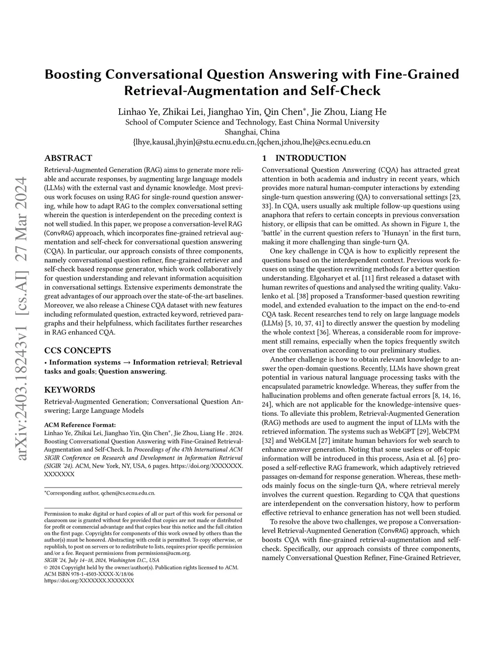 Retrieval-Augmented Generation (RAG) aims to generate more reliable and accurate responses, by augmenting large language models (LLMs) with the external vast and dynamic knowledge. Most previous work focuses on using RAG for single-round question answering, while how to adapt RAG to the complex conversational setting wherein the question is interdependent on the preceding context is not well studied. In this paper, we propose a conversation-level RAG approach, which incorporates fine-grained retrieval augmentation and self-check for conversational question answering (CQA). In particular, our approach consists of three components, namely conversational question refiner, fine-grained retriever and self-check based response generator, which work collaboratively for question understanding and relevant information acquisition in conversational settings. Extensive experiments demonstrate the great advantages of our approach over the state-of-the-art baselines. Moreover, we also release a Chinese CQA dataset with new features including reformulated question, extracted keyword, retrieved paragraphs and their helpfulness, which facilitates further researches in RAG enhanced CQA.