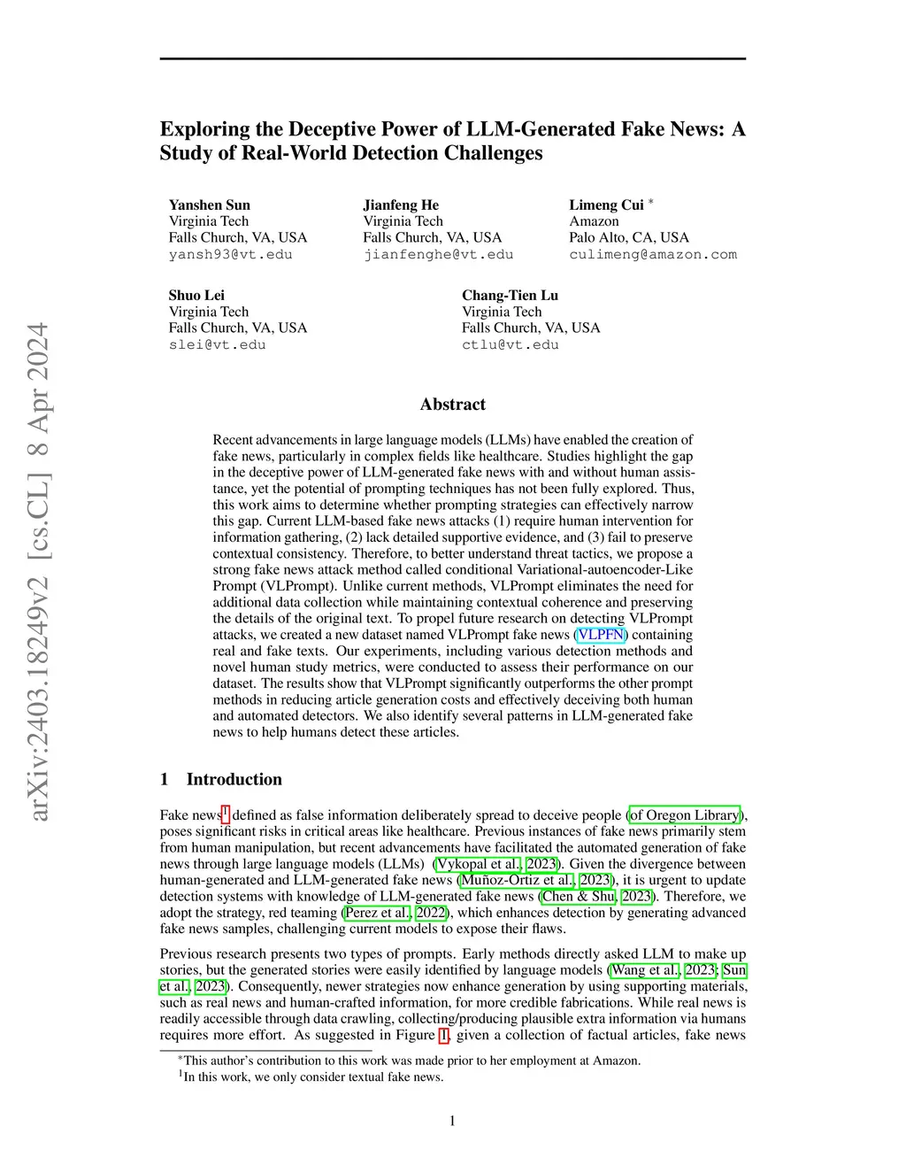 Recent advancements in Large Language Models (LLMs) have enabled the creation of fake news, particularly in complex fields like healthcare. Studies highlight the gap in the deceptive power of LLM-generated fake news with and without human assistance, yet the potential of prompting techniques has not been fully explored. Thus, this work aims to determine whether prompting strategies can effectively narrow this gap. Current LLM-based fake news attacks require human intervention for information gathering and often miss details and fail to maintain context consistency. Therefore, to better understand threat tactics, we propose a strong fake news attack method called conditional Variational-autoencoder-Like Prompt (VLPrompt). Unlike current methods, VLPrompt eliminates the need for additional data collection while maintaining contextual coherence and preserving the intricacies of the original text. To propel future research on detecting VLPrompt attacks, we created a new dataset named VLPrompt fake news (VLPFN) containing real and fake texts. Our experiments, including various detection methods and novel human study metrics, were conducted to assess their performance on our dataset, yielding numerous findings.