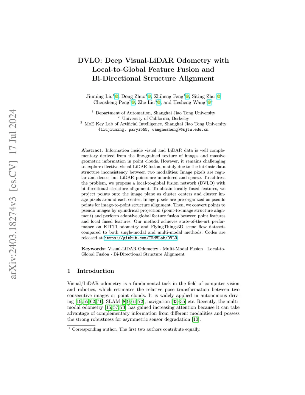 Information inside visual and LiDAR data is well complementary derived from the fine-grained texture of images and massive geometric information in point clouds. However, it remains challenging to explore effective visual-LiDAR fusion, mainly due to the intrinsic data structure inconsistency between two modalities: Image pixels are regular and dense, but LiDAR points are unordered and sparse. To address the problem, we propose a local-to-global fusion network (DVLO) with bi-directional structure alignment. To obtain locally fused features, we project points onto the image plane as cluster centers and cluster image pixels around each center. Image pixels are pre-organized as pseudo points for image-to-point structure alignment. Then, we convert points to pseudo images by cylindrical projection (point-to-image structure alignment) and perform adaptive global feature fusion between point features and local fused features. Our method achieves state-of-the-art performance on KITTI odometry and FlyingThings3D scene flow datasets compared to both single-modal and multi-modal methods. Codes are released at https://github.com/IRMVLab/DVLO.
