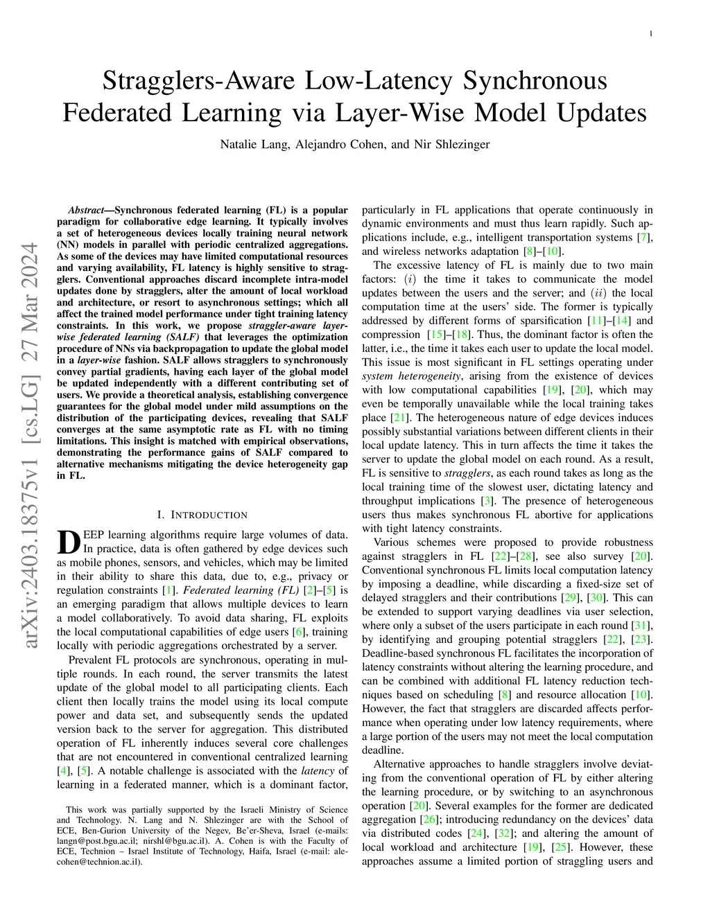 Synchronous federated learning (FL) is a popular paradigm for collaborative edge learning. It typically involves a set of heterogeneous devices locally training neural network (NN) models in parallel with periodic centralized aggregations. As some of the devices may have limited computational resources and varying availability, FL latency is highly sensitive to stragglers. Conventional approaches discard incomplete intra-model updates done by stragglers, alter the amount of local workload and architecture, or resort to asynchronous settings; which all affect the trained model performance under tight training latency constraints. In this work, we propose straggler-aware layer-wise federated learning (SALF) that leverages the optimization procedure of NNs via backpropagation to update the global model in a layer-wise fashion. SALF allows stragglers to synchronously convey partial gradients, having each layer of the global model be updated independently with a different contributing set of users. We provide a theoretical analysis, establishing convergence guarantees for the global model under mild assumptions on the distribution of the participating devices, revealing that SALF converges at the same asymptotic rate as FL with no timing limitations. This insight is matched with empirical observations, demonstrating the performance gains of SALF compared to alternative mechanisms mitigating the device heterogeneity gap in FL.