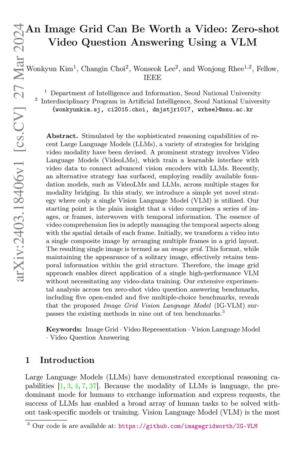Stimulated by the sophisticated reasoning capabilities of recent Large Language Models (LLMs), a variety of strategies for bridging video modality have been devised. A prominent strategy involves Video Language Models (VideoLMs), which train a learnable interface with video data to connect advanced vision encoders with LLMs. Recently, an alternative strategy has surfaced, employing readily available foundation models, such as VideoLMs and LLMs, across multiple stages for modality bridging. In this study, we introduce a simple yet novel strategy where only a single Vision Language Model (VLM) is utilized. Our starting point is the plain insight that a video comprises a series of images, or frames, interwoven with temporal information. The essence of video comprehension lies in adeptly managing the temporal aspects along with the spatial details of each frame. Initially, we transform a video into a single composite image by arranging multiple frames in a grid layout. The resulting single image is termed as an image grid. This format, while maintaining the appearance of a solitary image, effectively retains temporal information within the grid structure. Therefore, the image grid approach enables direct application of a single high-performance VLM without necessitating any video-data training. Our extensive experimental analysis across ten zero-shot video question answering benchmarks, including five open-ended and five multiple-choice benchmarks, reveals that the proposed Image Grid Vision Language Model (IG-VLM) surpasses the existing methods in nine out of ten benchmarks.