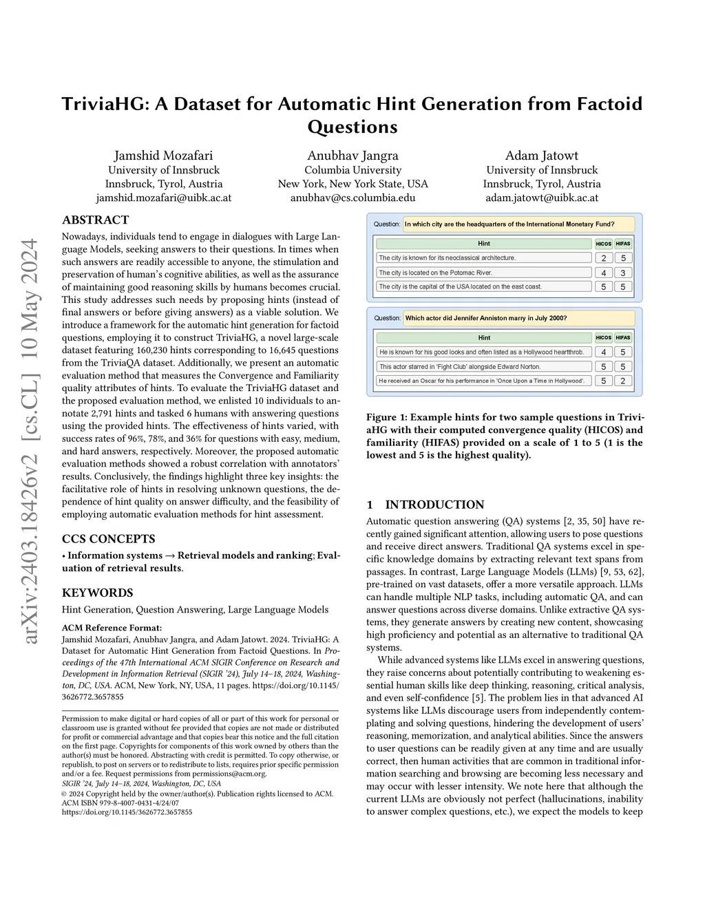 Nowadays, individuals tend to engage in dialogues with Large Language Models, seeking answers to their questions. In times when such answers are readily accessible to anyone, the stimulation and preservation of human's cognitive abilities, as well as the assurance of maintaining good reasoning skills by humans becomes crucial. This study addresses such needs by proposing hints (instead of final answers or before giving answers) as a viable solution. We introduce a framework for the automatic hint generation for factoid questions, employing it to construct TriviaHG, a novel large-scale dataset featuring 160,230 hints corresponding to 16,645 questions from the TriviaQA dataset. Additionally, we present an automatic evaluation method that measures the Convergence and Familiarity quality attributes of hints. To evaluate the TriviaHG dataset and the proposed evaluation method, we enlisted 10 individuals to annotate 2,791 hints and tasked 6 humans with answering questions using the provided hints. The effectiveness of hints varied, with success rates of 96%, 78%, and 36% for questions with easy, medium, and hard answers, respectively. Moreover, the proposed automatic evaluation methods showed a robust correlation with annotators' results. Conclusively, the findings highlight three key insights: the facilitative role of hints in resolving unknown questions, the dependence of hint quality on answer difficulty, and the feasibility of employing automatic evaluation methods for hint assessment.