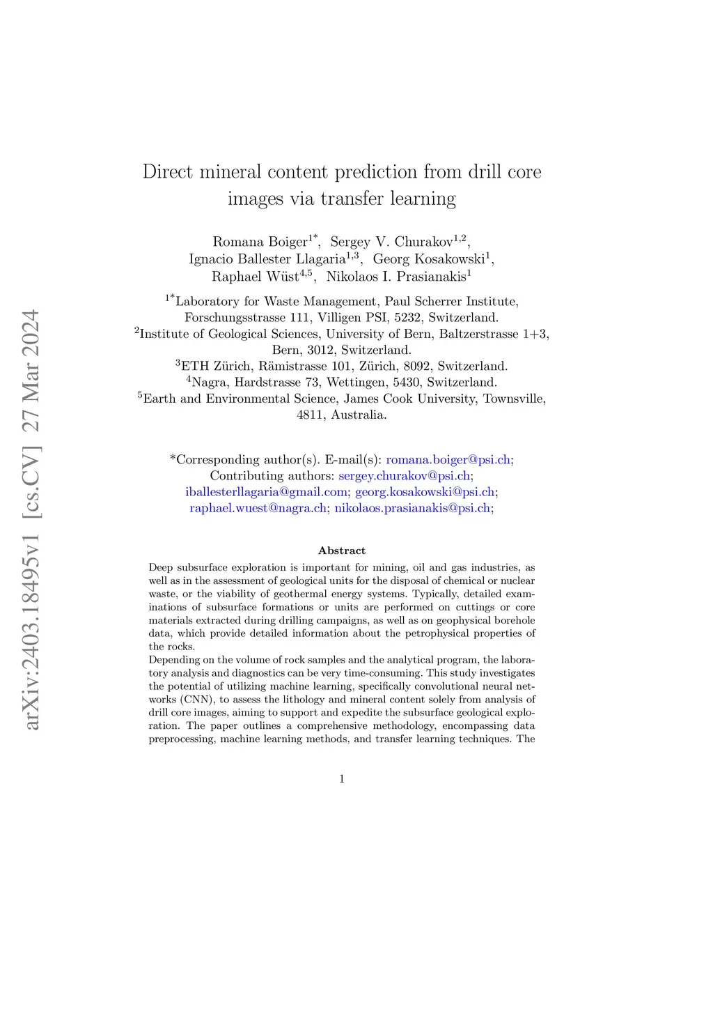 Deep subsurface exploration is important for mining, oil and gas industries, as well as in the assessment of geological units for the disposal of chemical or nuclear waste, or the viability of geothermal energy systems. Typically, detailed examinations of subsurface formations or units are performed on cuttings or core materials extracted during drilling campaigns, as well as on geophysical borehole data, which provide detailed information about the petrophysical properties of the rocks. Depending on the volume of rock samples and the analytical program, the laboratory analysis and diagnostics can be very time-consuming. This study investigates the potential of utilizing machine learning, specifically convolutional neural networks (CNN), to assess the lithology and mineral content solely from analysis of drill core images, aiming to support and expedite the subsurface geological exploration. The paper outlines a comprehensive methodology, encompassing data preprocessing, machine learning methods, and transfer learning techniques. The outcome reveals a remarkable 96.7% accuracy in the classification of drill core segments into distinct formation classes. Furthermore, a CNN model was trained for the evaluation of mineral content using a learning data set from multidimensional log analysis data (silicate, total clay, carbonate). When benchmarked against laboratory XRD measurements on samples from the cores, both the advanced multidimensional log analysis model and the neural network approach developed here provide equally good performance. This work demonstrates that deep learning and particularly transfer learning can support extracting petrophysical properties, including mineral content and formation classification, from drill core images, thus offering a road map for enhancing model performance and data set quality in image-based analysis of drill cores.