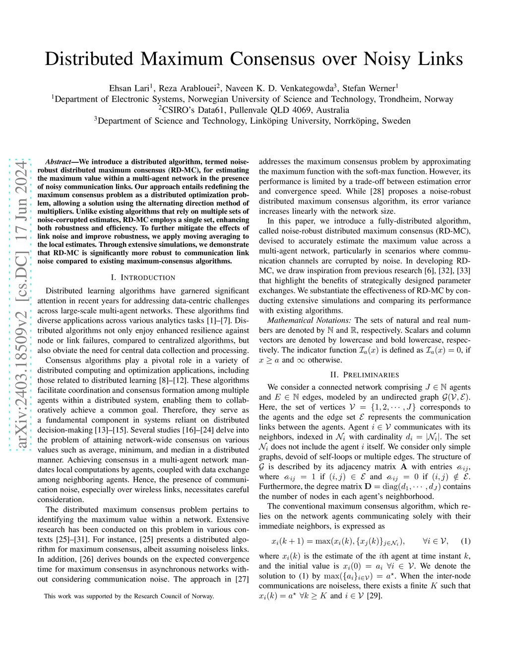 We introduce a distributed algorithm, termed noise-robust distributed maximum consensus (RD-MC), for estimating the maximum value within a multi-agent network in the presence of noisy communication links. Our approach entails redefining the maximum consensus problem as a distributed optimization problem, allowing a solution using the alternating direction method of multipliers. Unlike existing algorithms that rely on multiple sets of noise-corrupted estimates, RD-MC employs a single set, enhancing both robustness and efficiency. To further mitigate the effects of link noise and improve robustness, we apply moving averaging to the local estimates. Through extensive simulations, we demonstrate that RD-MC is significantly more robust to communication link noise compared to existing maximum-consensus algorithms.