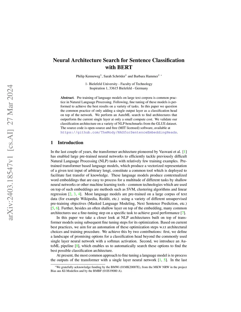 Neural Architecture Search for Sentence Classification with BERT