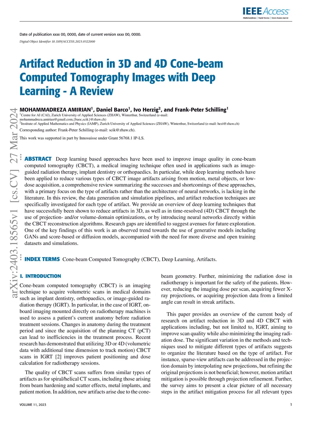 Deep learning based approaches have been used to improve image quality in cone-beam computed tomography (CBCT), a medical imaging technique often used in applications such as image-guided radiation therapy, implant dentistry or orthopaedics. In particular, while deep learning methods have been applied to reduce various types of CBCT image artifacts arising from motion, metal objects, or low-dose acquisition, a comprehensive review summarizing the successes and shortcomings of these approaches, with a primary focus on the type of artifacts rather than the architecture of neural networks, is lacking in the literature. In this review, the data generation and simulation pipelines, and artifact reduction techniques are specifically investigated for each type of artifact. We provide an overview of deep learning techniques that have successfully been shown to reduce artifacts in 3D, as well as in time-resolved (4D) CBCT through the use of projection- and/or volume-domain optimizations, or by introducing neural networks directly within the CBCT reconstruction algorithms. Research gaps are identified to suggest avenues for future exploration. One of the key findings of this work is an observed trend towards the use of generative models including GANs and score-based or diffusion models, accompanied with the need for more diverse and open training datasets and simulations.