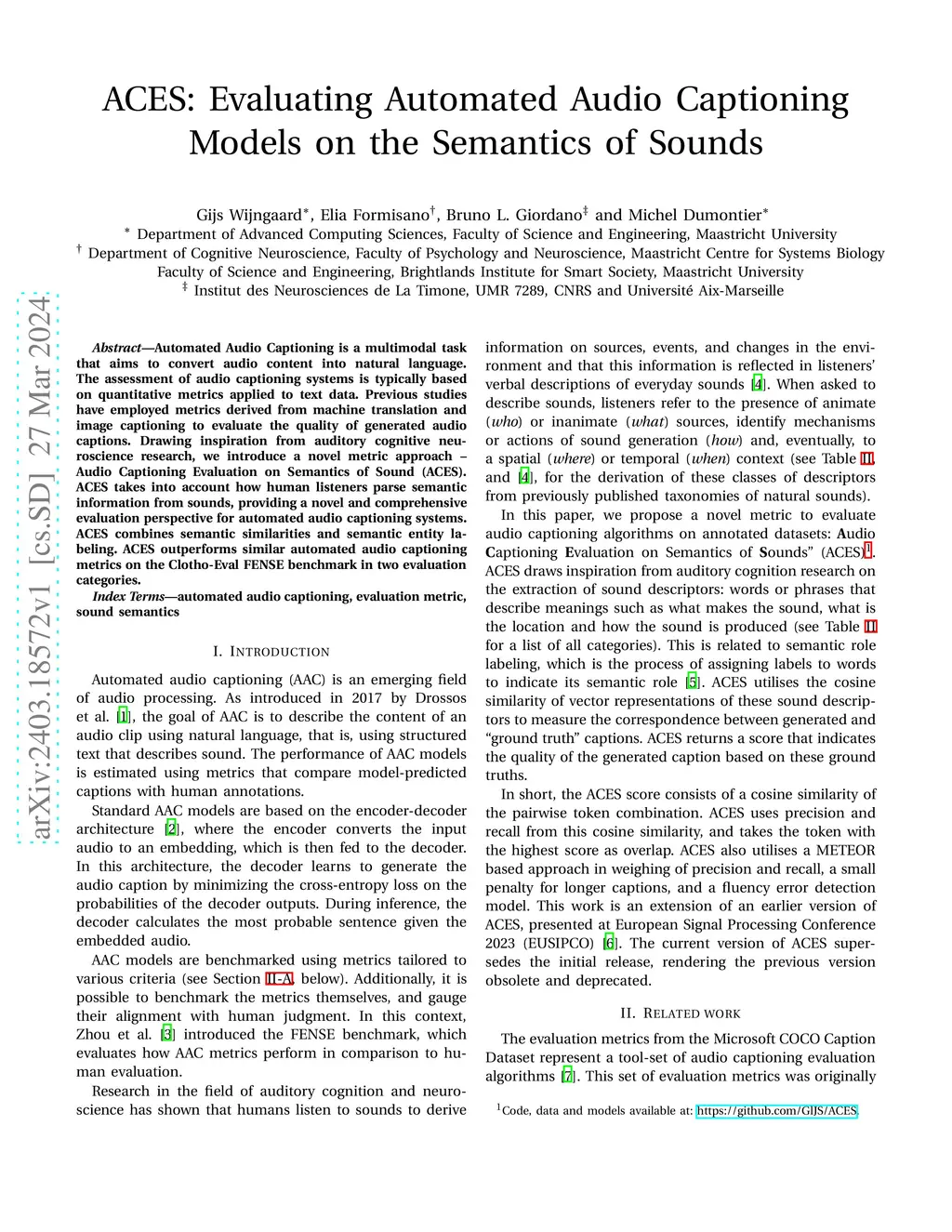 Automated Audio Captioning is a multimodal task that aims to convert audio content into natural language. The assessment of audio captioning systems is typically based on quantitative metrics applied to text data. Previous studies have employed metrics derived from machine translation and image captioning to evaluate the quality of generated audio captions. Drawing inspiration from auditory cognitive neuroscience research, we introduce a novel metric approach -- Audio Captioning Evaluation on Semantics of Sound (ACES). ACES takes into account how human listeners parse semantic information from sounds, providing a novel and comprehensive evaluation perspective for automated audio captioning systems. ACES combines semantic similarities and semantic entity labeling. ACES outperforms similar automated audio captioning metrics on the Clotho-Eval FENSE benchmark in two evaluation categories.