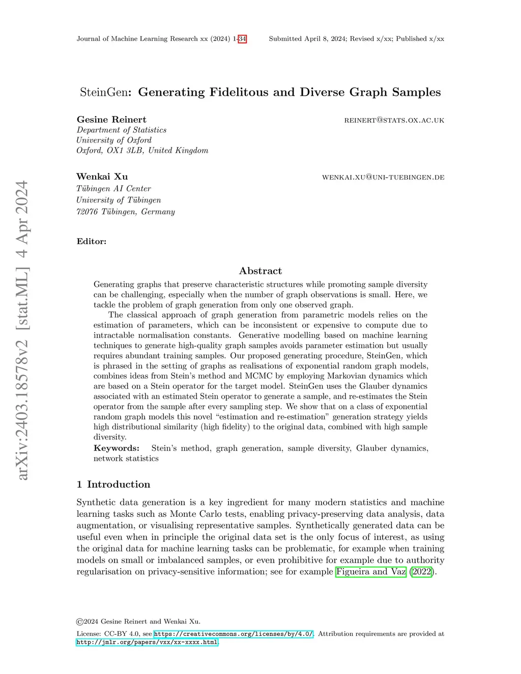 Generating graphs that preserve characteristic structures while promoting sample diversity can be challenging, especially when the number of graph observations is small. Here, we tackle the problem of graph generation from only one observed graph. The classical approach of graph generation from parametric models relies on the estimation of parameters, which can be inconsistent or expensive to compute due to intractable normalisation constants. Generative modelling based on machine learning techniques to generate high-quality graph samples avoids parameter estimation but usually requires abundant training samples. Our proposed generating procedure, SteinGen, which is phrased in the setting of graphs as realisations of exponential random graph models, combines ideas from Stein's method and MCMC by employing Markovian dynamics which are based on a Stein operator for the target model. SteinGen uses the Glauber dynamics associated with an estimated Stein operator to generate a sample, and re-estimates the Stein operator from the sample after every sampling step. We show that on a class of exponential random graph models this novel "estimation and re-estimation" generation strategy yields high distributional similarity (high fidelity) to the original data, combined with high sample diversity.