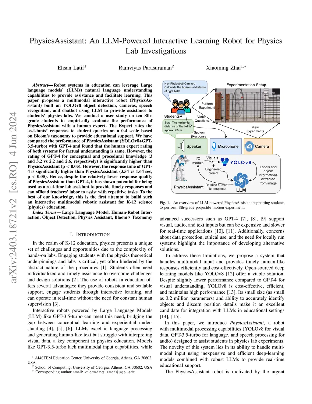Robot systems in education can leverage Large language models' (LLMs) natural language understanding capabilities to provide assistance and facilitate learning. This paper proposes a multimodal interactive robot (PhysicsAssistant) built on YOLOv8 object detection, cameras, speech recognition, and chatbot using LLM to provide assistance to students' physics labs. We conduct a user study on ten 8th-grade students to empirically evaluate the performance of PhysicsAssistant with a human expert. The Expert rates the assistants' responses to student queries on a 0-4 scale based on Bloom's taxonomy to provide educational support. We have compared the performance of PhysicsAssistant (YOLOv8+GPT-3.5-turbo) with GPT-4 and found that the human expert rating of both systems for factual understanding is the same. However, the rating of GPT-4 for conceptual and procedural knowledge (3 and 3.2 vs 2.2 and 2.6, respectively) is significantly higher than PhysicsAssistant (p < 0.05). However, the response time of GPT-4 is significantly higher than PhysicsAssistant (3.54 vs 1.64 sec, p < 0.05). Hence, despite the relatively lower response quality of PhysicsAssistant than GPT-4, it has shown potential for being used as a real-time lab assistant to provide timely responses and can offload teachers' labor to assist with repetitive tasks. To the best of our knowledge, this is the first attempt to build such an interactive multimodal robotic assistant for K-12 science (physics) education.
