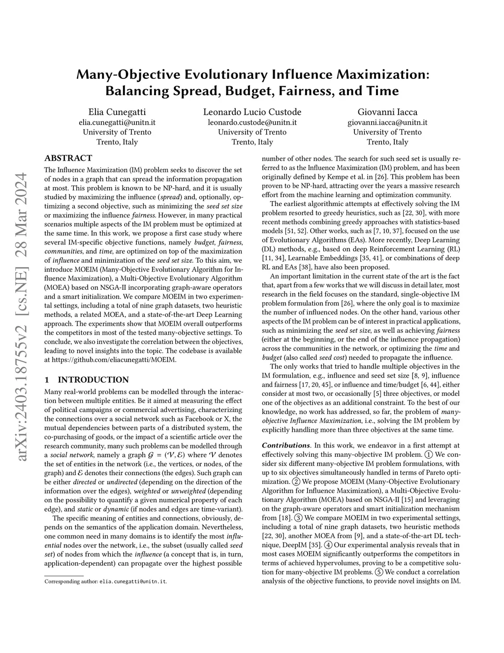 The Influence Maximization (IM) problem seeks to discover the set of nodes in a graph that can spread the information propagation at most. This problem is known to be NP-hard, and it is usually studied by maximizing the influence (spread) and, optionally, optimizing a second objective, such as minimizing the seed set size or maximizing the influence fairness. However, in many practical scenarios multiple aspects of the IM problem must be optimized at the same time. In this work, we propose a first case study where several IM-specific objective functions, namely budget, fairness, communities, and time, are optimized on top of the maximization of influence and minimization of the seed set size. To this aim, we introduce MOEIM (Many-Objective Evolutionary Algorithm for Influence Maximization) a Multi-Objective Evolutionary Algorithm (MOEA) based on NSGA-II incorporating graph-aware operators and a smart initialization. We compare MOEIM in two experimental settings, including a total of nine graph datasets, two heuristic methods, a related MOEA, and a state-of-the-art Deep Learning approach. The experiments show that MOEIM overall outperforms the competitors in most of the tested many-objective settings. To conclude, we also investigate the correlation between the objectives, leading to novel insights into the topic. The codebase is available at https://github.com/eliacunegatti/MOEIM.