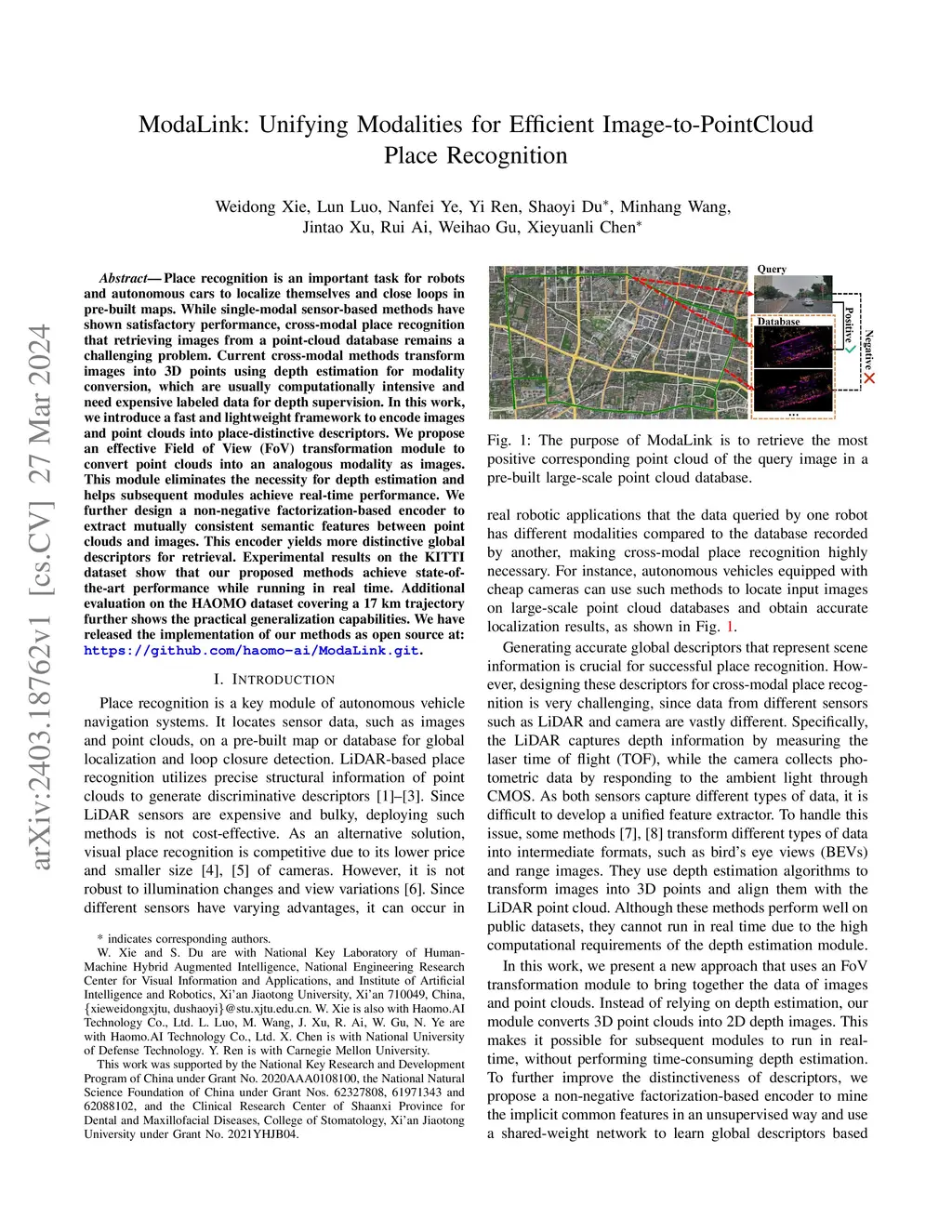 Place recognition is an important task for robots and autonomous cars to localize themselves and close loops in pre-built maps. While single-modal sensor-based methods have shown satisfactory performance, cross-modal place recognition that retrieving images from a point-cloud database remains a challenging problem. Current cross-modal methods transform images into 3D points using depth estimation for modality conversion, which are usually computationally intensive and need expensive labeled data for depth supervision. In this work, we introduce a fast and lightweight framework to encode images and point clouds into place-distinctive descriptors. We propose an effective Field of View (FoV) transformation module to convert point clouds into an analogous modality as images. This module eliminates the necessity for depth estimation and helps subsequent modules achieve real-time performance. We further design a non-negative factorization-based encoder to extract mutually consistent semantic features between point clouds and images. This encoder yields more distinctive global descriptors for retrieval. Experimental results on the KITTI dataset show that our proposed methods achieve state-of-the-art performance while running in real time. Additional evaluation on the HAOMO dataset covering a 17 km trajectory further shows the practical generalization capabilities. We have released the implementation of our methods as open source at: https://github.com/haomo-ai/ModaLink.git.