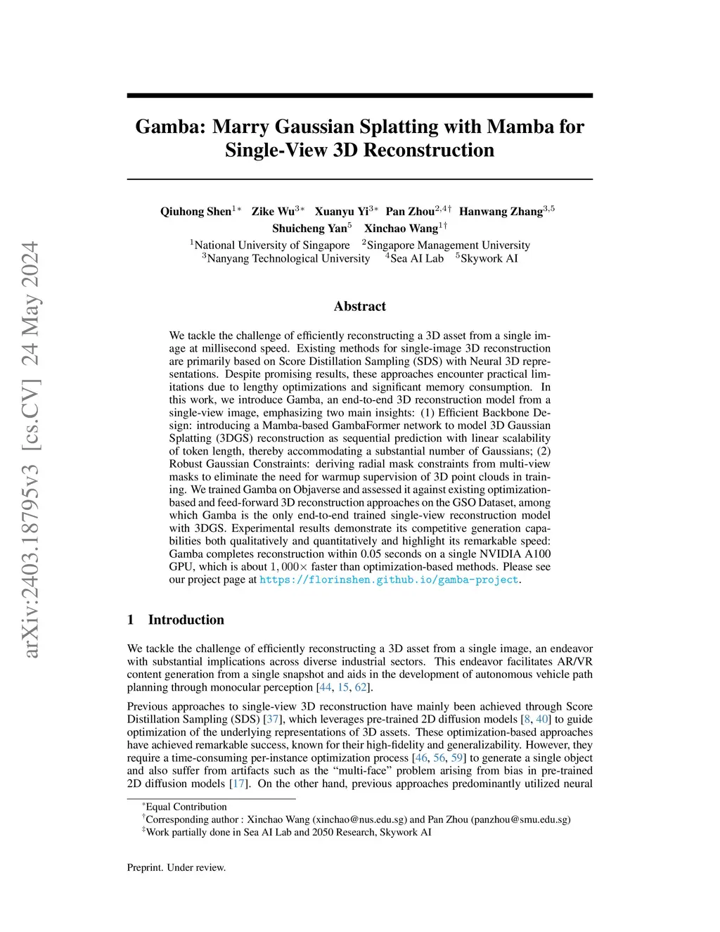 Gamba: Marry Gaussian Splatting with Mamba for single view 3D