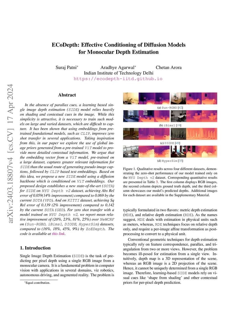In the absence of parallax cues, a learning-based single image depth estimation (SIDE) model relies heavily on shading and contextual cues in the image. While this simplicity is attractive, it is necessary to train such models on large and varied datasets, which are difficult to capture. It has been shown that using embeddings from pre-trained foundational models, such as CLIP, improves zero shot transfer in several applications. Taking inspiration from this, in our paper we explore the use of global image priors generated from a pre-trained ViT model to provide more detailed contextual information. We argue that the embedding vector from a ViT model, pre-trained on a large dataset, captures greater relevant information for SIDE than the usual route of generating pseudo image captions, followed by CLIP based text embeddings. Based on this idea, we propose a new SIDE model using a diffusion backbone which is conditioned on ViT embeddings. Our proposed design establishes a new state-of-the-art (SOTA) for SIDE on NYUv2 dataset, achieving Abs Rel error of 0.059 (14% improvement) compared to 0.069 by the current SOTA (VPD). And on KITTI dataset, achieving Sq Rel error of 0.139 (2% improvement) compared to 0.142 by the current SOTA (GEDepth). For zero-shot transfer with a model trained on NYUv2, we report mean relative improvement of (20%, 23%, 81%, 25%) over NeWCRFs on (Sun-RGBD, iBims1, DIODE, HyperSim) datasets, compared to (16%, 18%, 45%, 9%) by ZoeDepth. The project page is available at https://ecodepth-iitd.github.io