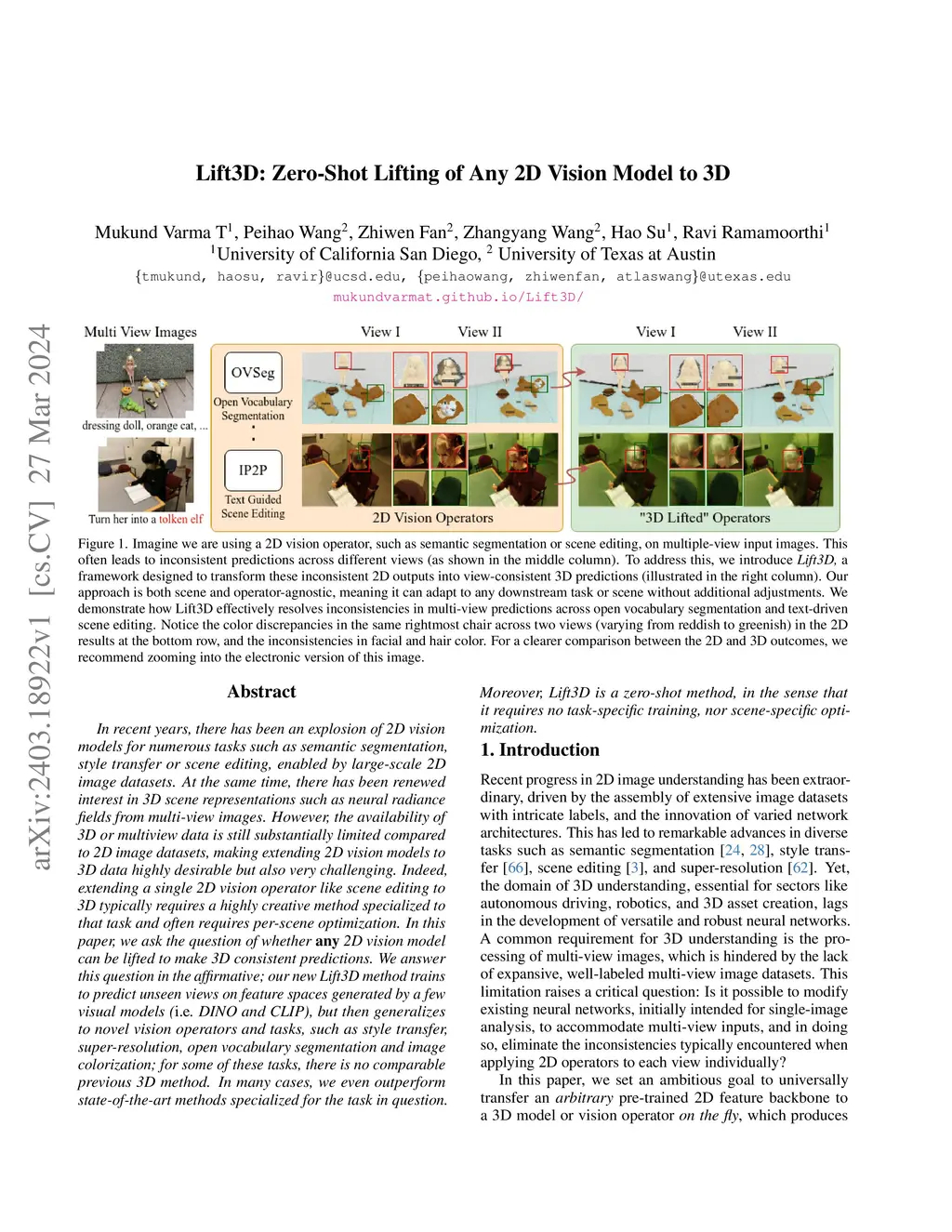 In recent years, there has been an explosion of 2D vision models for numerous tasks such as semantic segmentation, style transfer or scene editing, enabled by large-scale 2D image datasets. At the same time, there has been renewed interest in 3D scene representations such as neural radiance fields from multi-view images. However, the availability of 3D or multiview data is still substantially limited compared to 2D image datasets, making extending 2D vision models to 3D data highly desirable but also very challenging. Indeed, extending a single 2D vision operator like scene editing to 3D typically requires a highly creative method specialized to that task and often requires per-scene optimization. In this paper, we ask the question of whether any 2D vision model can be lifted to make 3D consistent predictions. We answer this question in the affirmative; our new Lift3D method trains to predict unseen views on feature spaces generated by a few visual models (i.e. DINO and CLIP), but then generalizes to novel vision operators and tasks, such as style transfer, super-resolution, open vocabulary segmentation and image colorization; for some of these tasks, there is no comparable previous 3D method. In many cases, we even outperform state-of-the-art methods specialized for the task in question. Moreover, Lift3D is a zero-shot method, in the sense that it requires no task-specific training, nor scene-specific optimization.