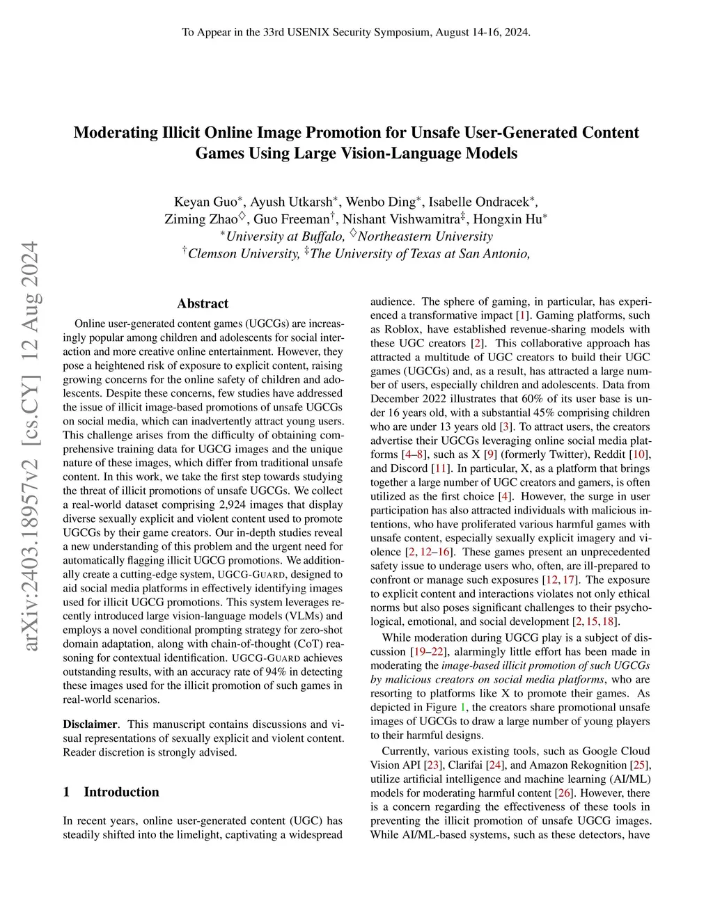 Online user-generated content games (UGCGs) are increasingly popular among children and adolescents for social interaction and more creative online entertainment. However, they pose a heightened risk of exposure to explicit content, raising growing concerns for the online safety of children and adolescents. Despite these concerns, few studies have addressed the issue of illicit image-based promotions of unsafe UGCGs on social media, which can inadvertently attract young users. This challenge arises from the difficulty of obtaining comprehensive training data for UGCG images and the unique nature of these images, which differ from traditional unsafe content. In this work, we take the first step towards studying the threat of illicit promotions of unsafe UGCGs. We collect a real-world dataset comprising 2,924 images that display diverse sexually explicit and violent content used to promote UGCGs by their game creators. Our in-depth studies reveal a new understanding of this problem and the urgent need for automatically flagging illicit UGCG promotions. We additionally create a cutting-edge system, UGCG-Guard, designed to aid social media platforms in effectively identifying images used for illicit UGCG promotions. This system leverages recently introduced large vision-language models (VLMs) and employs a novel conditional prompting strategy for zero-shot domain adaptation, along with chain-of-thought (CoT) reasoning for contextual identification. UGCG-Guard achieves outstanding results, with an accuracy rate of 94% in detecting these images used for the illicit promotion of such games in real-world scenarios.