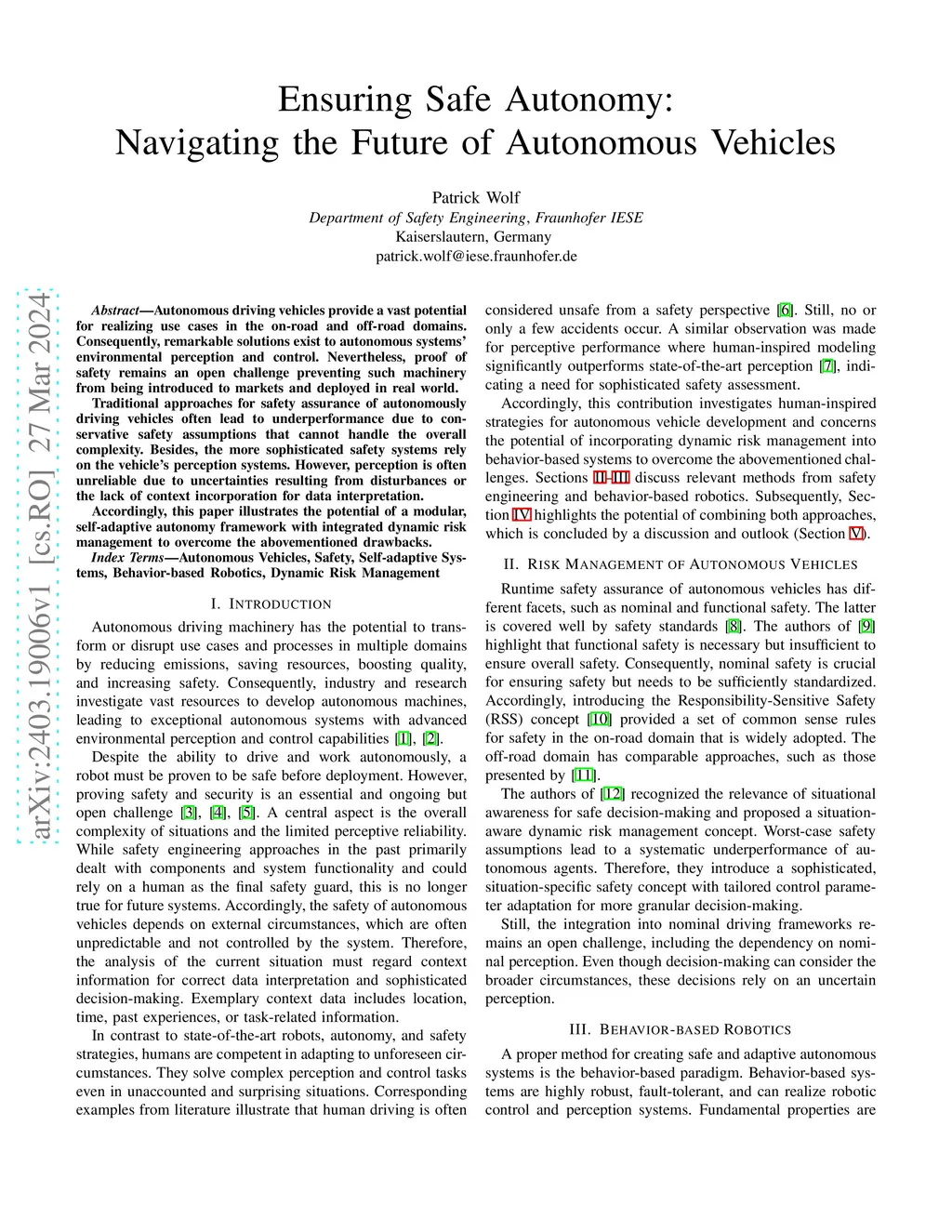 Autonomous driving vehicles provide a vast potential for realizing use cases in the on-road and off-road domains. Consequently, remarkable solutions exist to autonomous systems' environmental perception and control. Nevertheless, proof of safety remains an open challenge preventing such machinery from being introduced to markets and deployed in real world. Traditional approaches for safety assurance of autonomously driving vehicles often lead to underperformance due to conservative safety assumptions that cannot handle the overall complexity. Besides, the more sophisticated safety systems rely on the vehicle's perception systems. However, perception is often unreliable due to uncertainties resulting from disturbances or the lack of context incorporation for data interpretation. Accordingly, this paper illustrates the potential of a modular, self-adaptive autonomy framework with integrated dynamic risk management to overcome the abovementioned drawbacks.