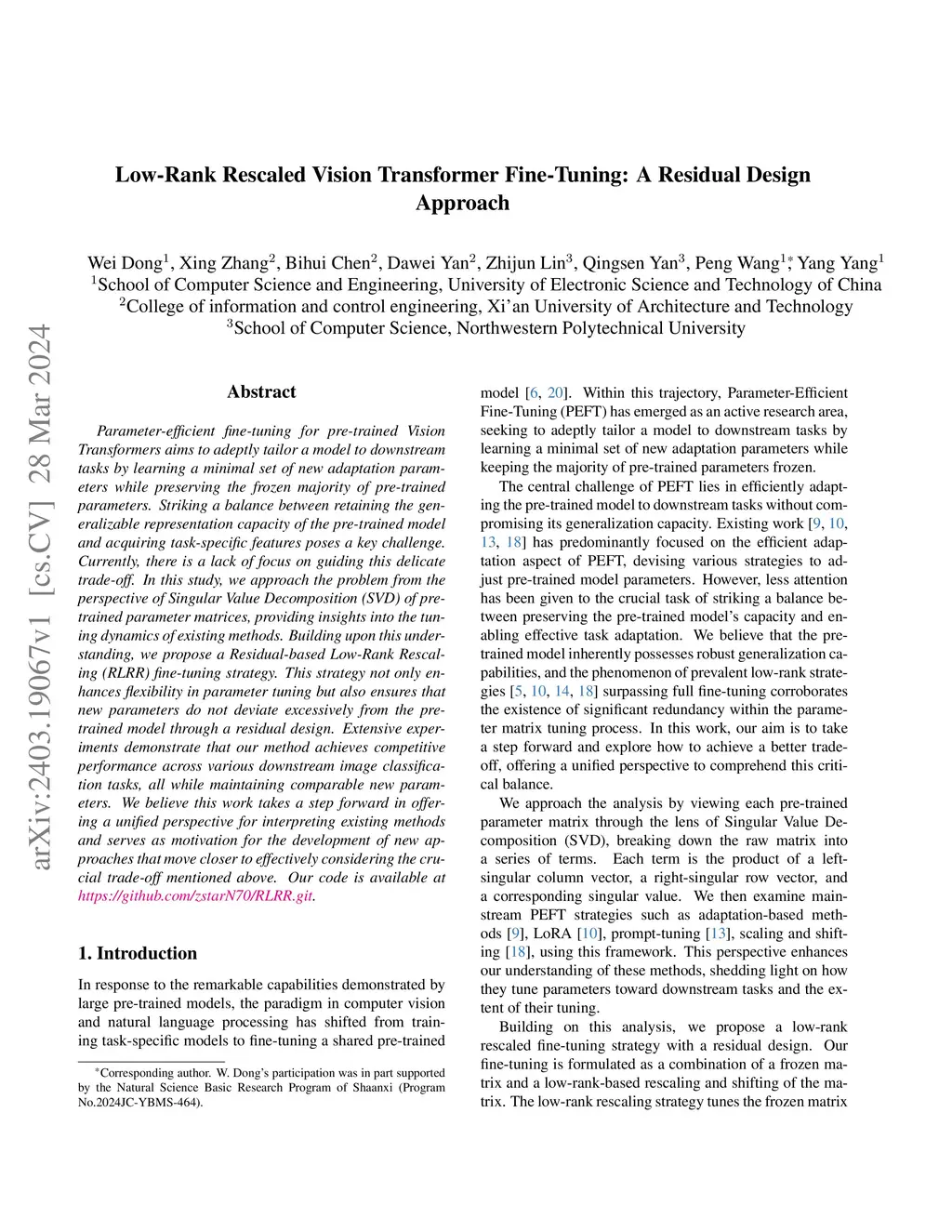 Low-Rank Rescaled Vision Transformer Fine-Tuning: A Residual Design