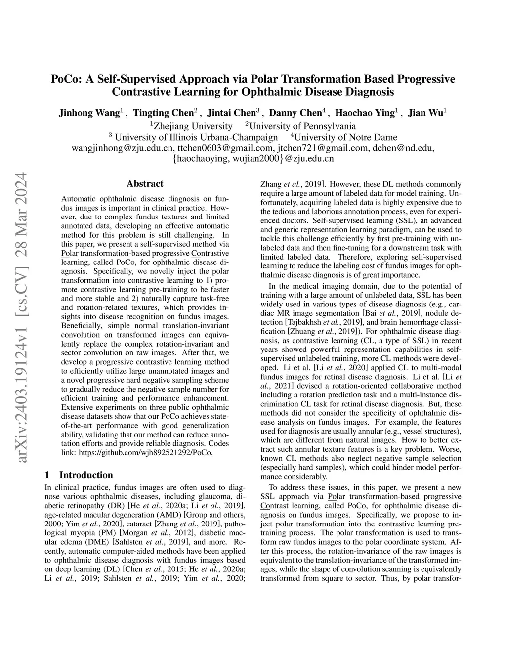 Automatic ophthalmic disease diagnosis on fundus images is important in clinical practice. However, due to complex fundus textures and limited annotated data, developing an effective automatic method for this problem is still challenging. In this paper, we present a self-supervised method via polar transformation based progressive contrastive learning, called PoCo, for ophthalmic disease diagnosis. Specifically, we novelly inject the polar transformation into contrastive learning to 1) promote contrastive learning pre-training to be faster and more stable and 2) naturally capture task-free and rotation-related textures, which provides insights into disease recognition on fundus images. Beneficially, simple normal translation-invariant convolution on transformed images can equivalently replace the complex rotation-invariant and sector convolution on raw images. After that, we develop a progressive contrastive learning method to efficiently utilize large unannotated images and a novel progressive hard negative sampling scheme to gradually reduce the negative sample number for efficient training and performance enhancement. Extensive experiments on three public ophthalmic disease datasets show that our PoCo achieves state-of-the-art performance with good generalization ability, validating that our method can reduce annotation efforts and provide reliable diagnosis. Codes are available at \url{https://github.com/wjh892521292/PoCo}.
