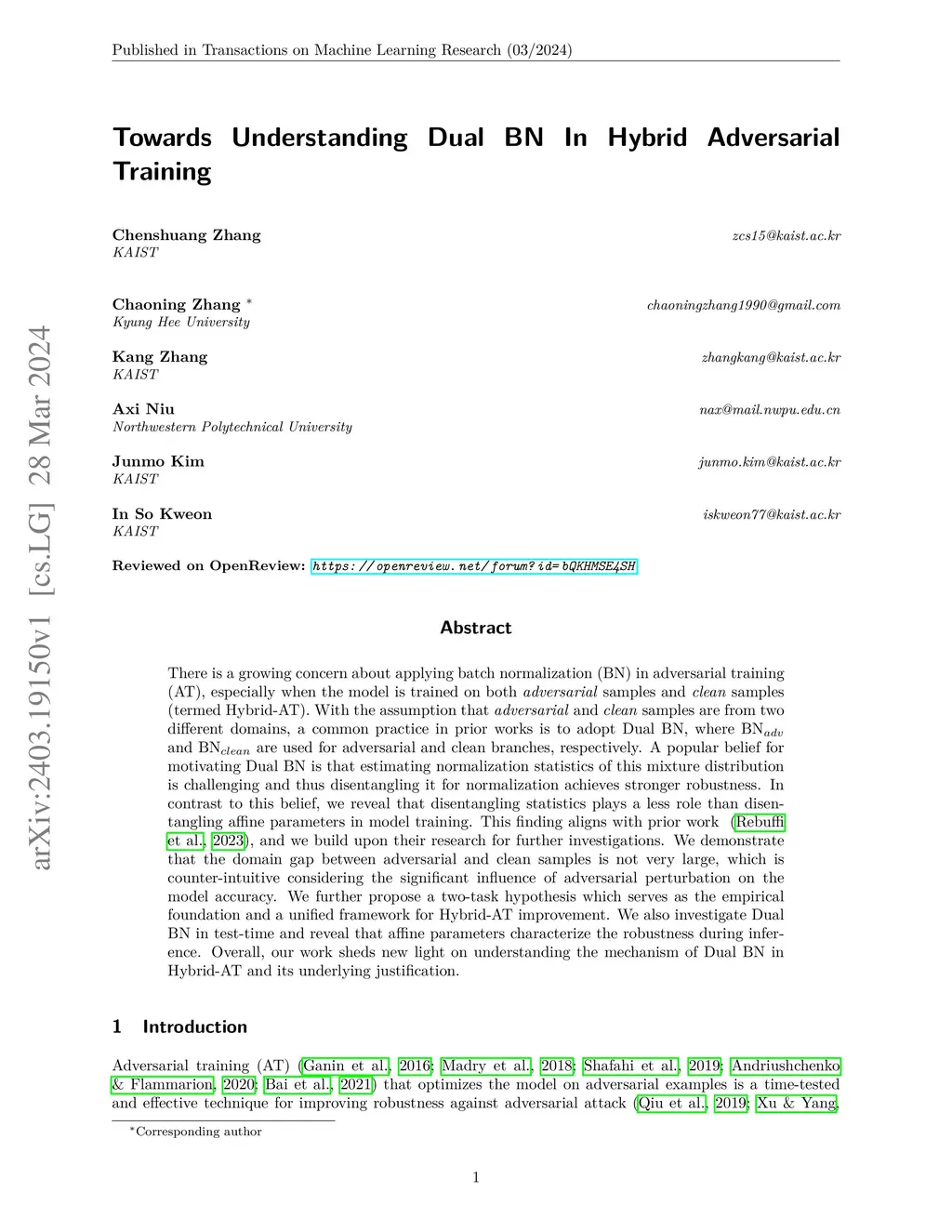 There is a growing concern about applying batch normalization (BN) in adversarial training (AT), especially when the model is trained on both adversarial samples and clean samples (termed Hybrid-AT). With the assumption that adversarial and clean samples are from two different domains, a common practice in prior works is to adopt Dual BN, where BN and BN are used for adversarial and clean branches, respectively. A popular belief for motivating Dual BN is that estimating normalization statistics of this mixture distribution is challenging and thus disentangling it for normalization achieves stronger robustness. In contrast to this belief, we reveal that disentangling statistics plays a less role than disentangling affine parameters in model training. This finding aligns with prior work (Rebuffi et al., 2023), and we build upon their research for further investigations. We demonstrate that the domain gap between adversarial and clean samples is not very large, which is counter-intuitive considering the significant influence of adversarial perturbation on the model accuracy. We further propose a two-task hypothesis which serves as the empirical foundation and a unified framework for Hybrid-AT improvement. We also investigate Dual BN in test-time and reveal that affine parameters characterize the robustness during inference. Overall, our work sheds new light on understanding the mechanism of Dual BN in Hybrid-AT and its underlying justification.