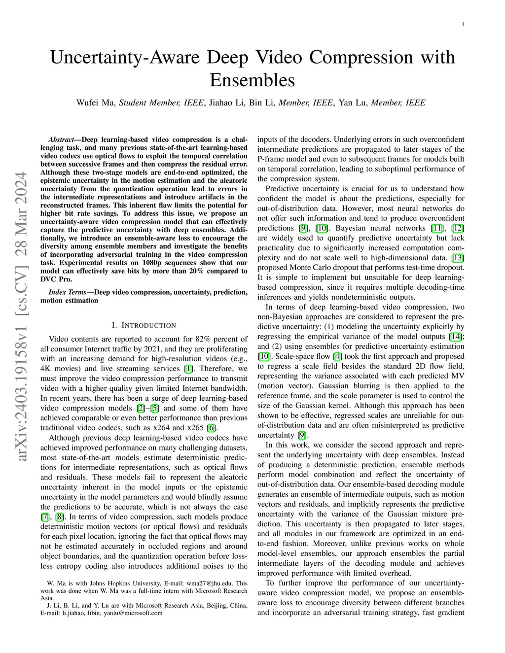 Deep learning-based video compression is a challenging task, and many previous state-of-the-art learning-based video codecs use optical flows to exploit the temporal correlation between successive frames and then compress the residual error. Although these two-stage models are end-to-end optimized, the epistemic uncertainty in the motion estimation and the aleatoric uncertainty from the quantization operation lead to errors in the intermediate representations and introduce artifacts in the reconstructed frames. This inherent flaw limits the potential for higher bit rate savings. To address this issue, we propose an uncertainty-aware video compression model that can effectively capture the predictive uncertainty with deep ensembles. Additionally, we introduce an ensemble-aware loss to encourage the diversity among ensemble members and investigate the benefits of incorporating adversarial training in the video compression task. Experimental results on 1080p sequences show that our model can effectively save bits by more than 20% compared to DVC Pro.
